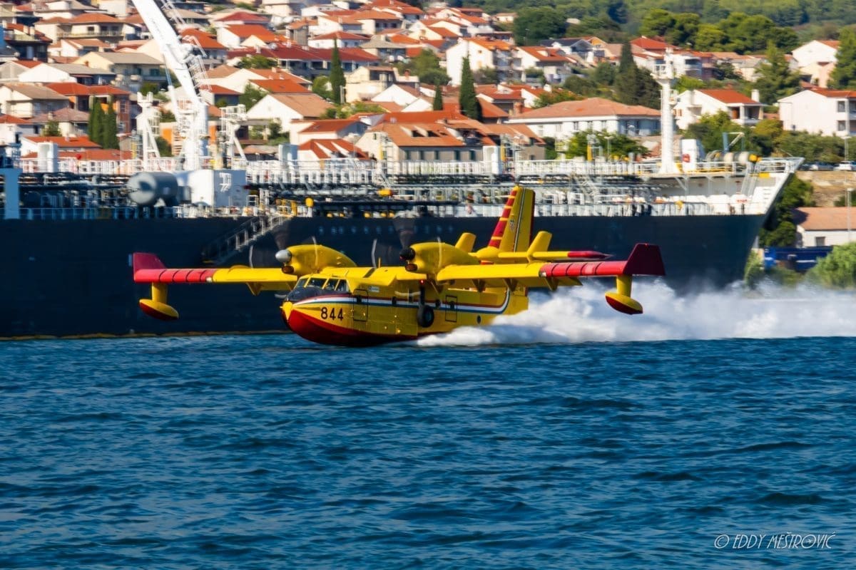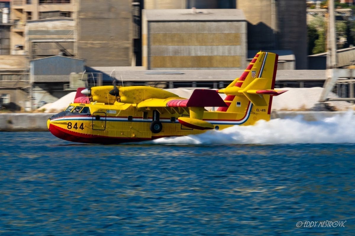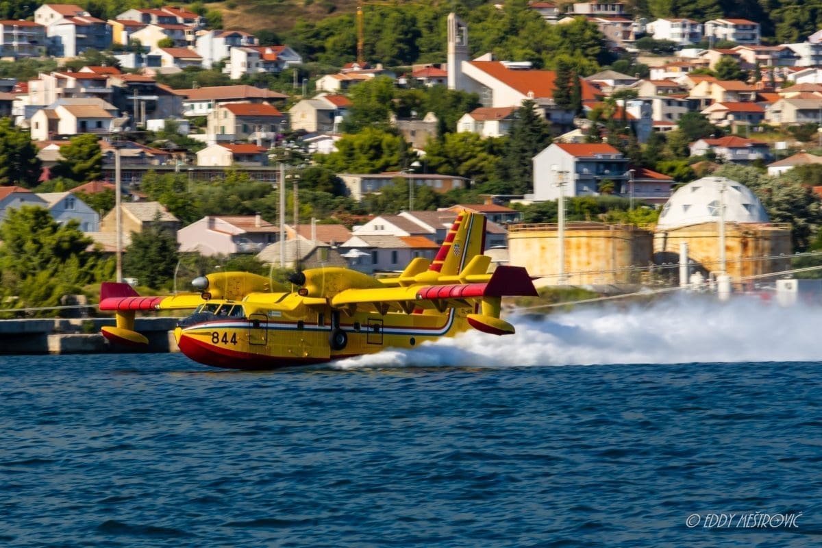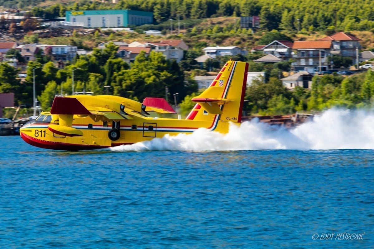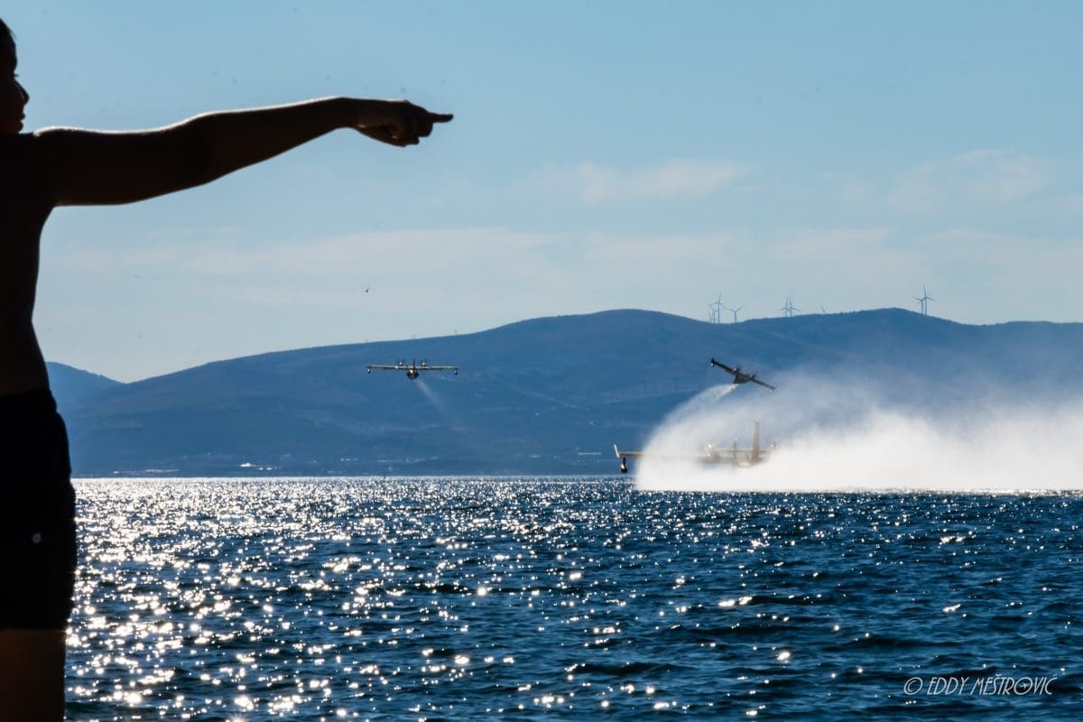 Eddy Meštrović uhvatio je nevjerojatne prizore kanadera koji uzimaju vodu u Kaštelanskom zaljevu, a najfascinantniji je onaj trenutak kada kanader prolazi kraj gumenjaka. Muškarac iz gumenjaka maše pilotu i ovaj mu uzvraća.