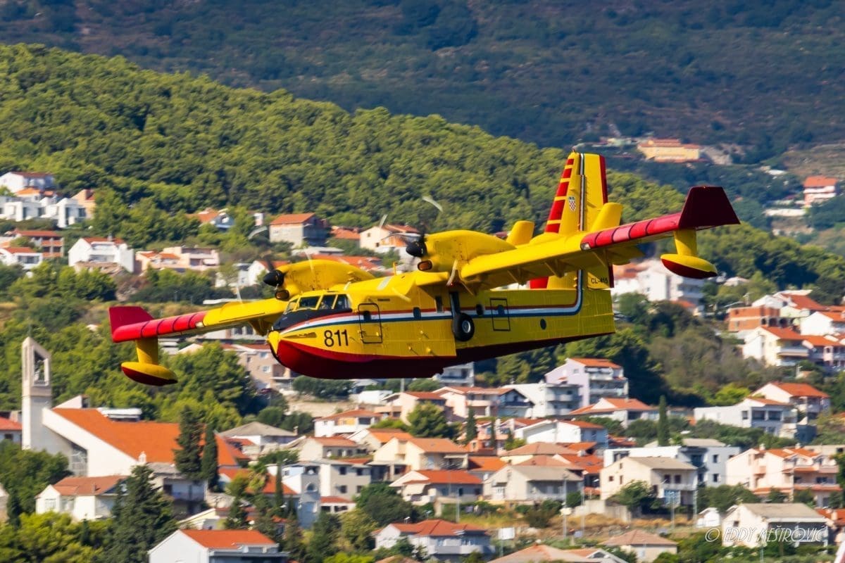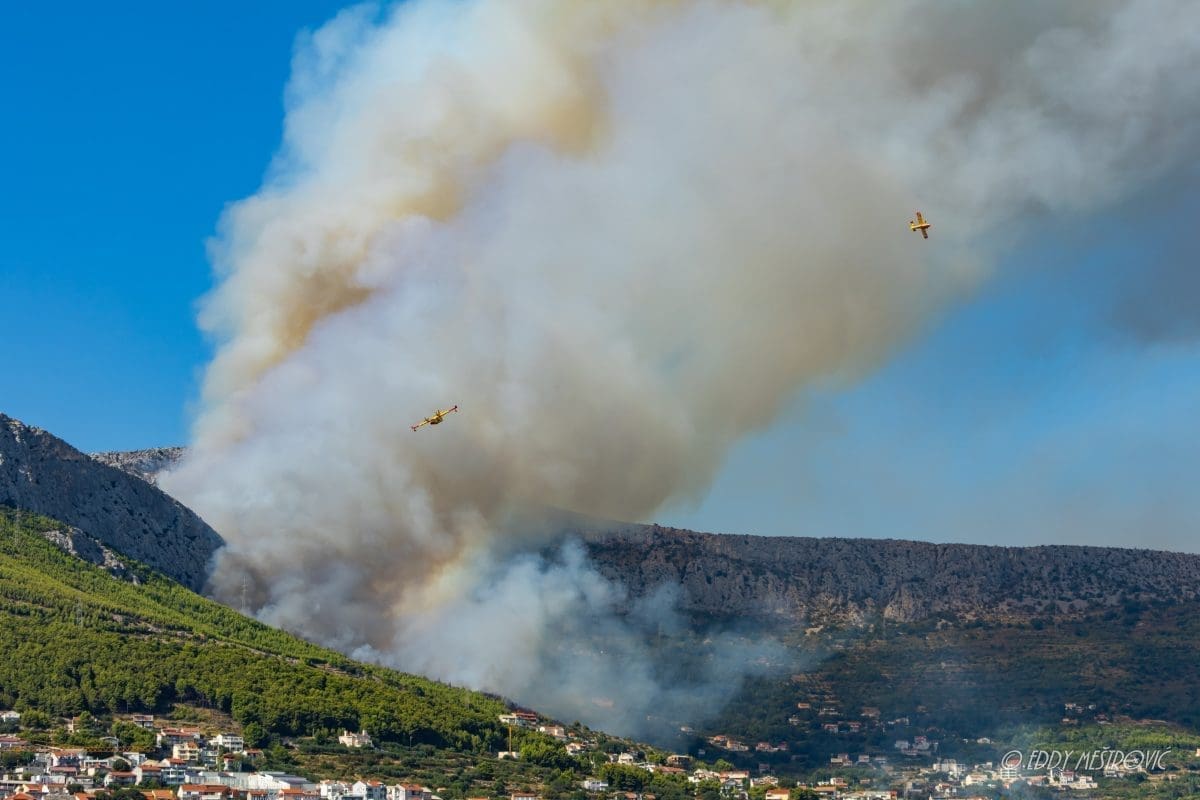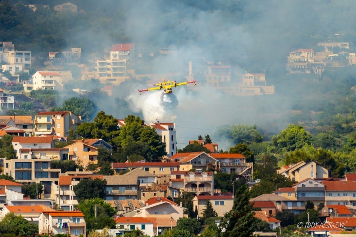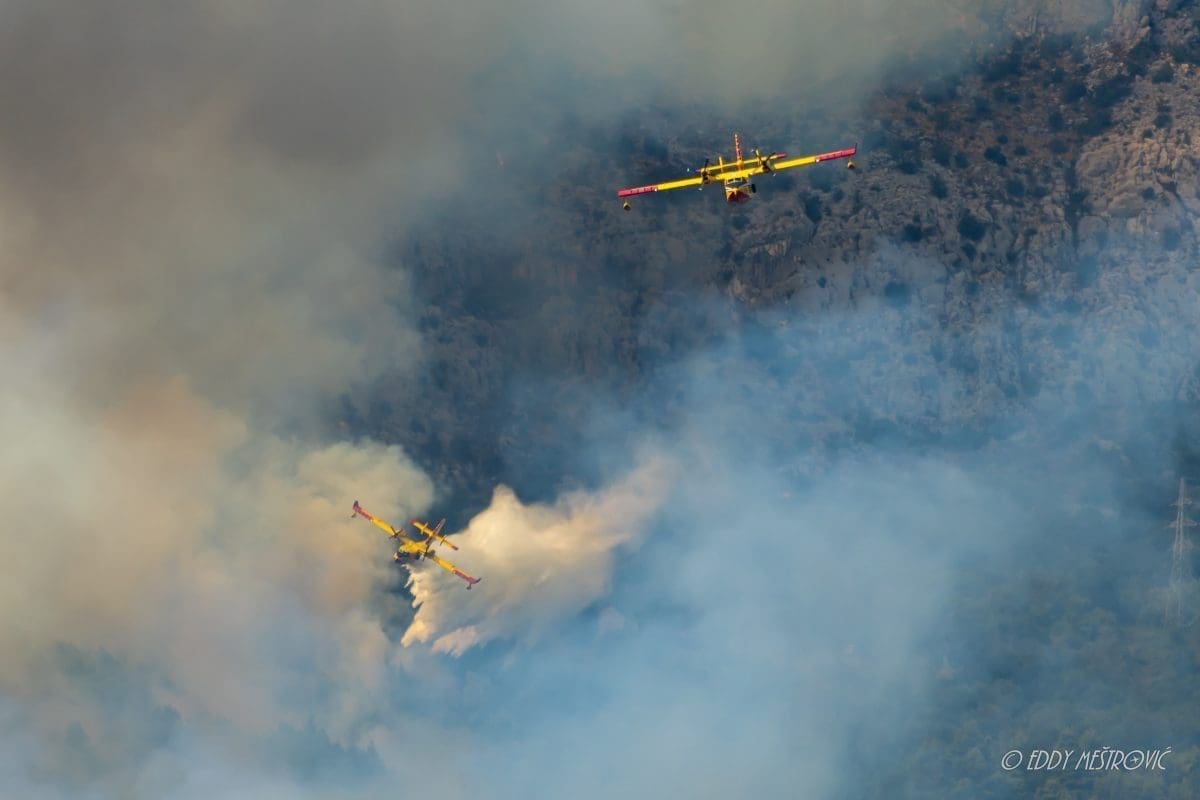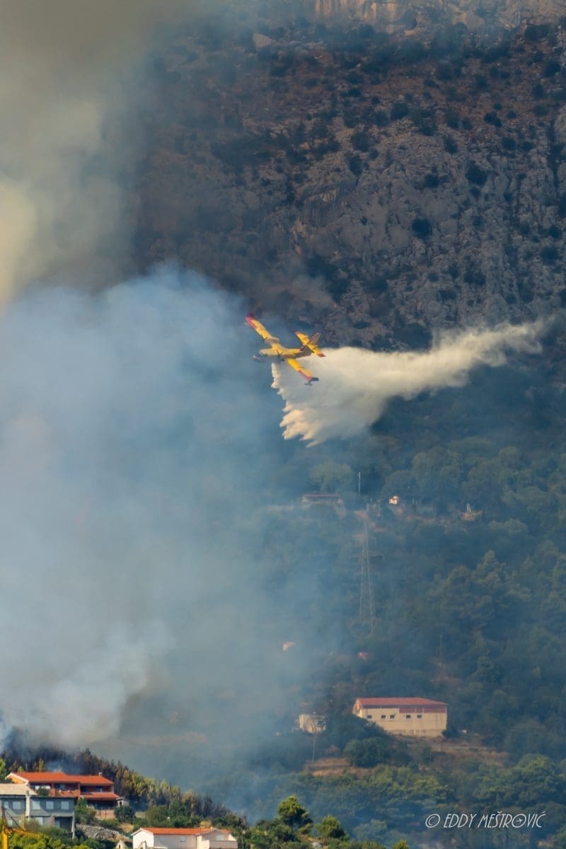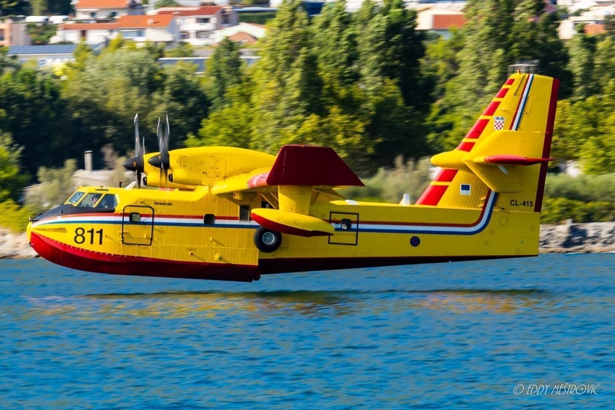 Eddy Meštrović uhvatio je nevjerojatne prizore kanadera koji uzimaju vodu u Kaštelanskom zaljevu, a najfascinantniji je onaj trenutak kada kanader prolazi kraj gumenjaka. Muškarac iz gumenjaka maše pilotu i ovaj mu uzvraća.