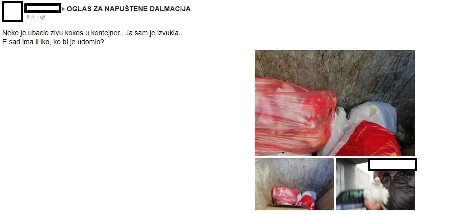 Podijeli Facebook Twitter Telegram WhatsApp E-mail adresa Na jednoj od Facebook grupa danas je objavljen nevjerojatan oglas. Naime, osoba je u oglasu napisala kako je pronašla živu kokoš u kontejneru te da je izvukla iz istog.Tekst se nastavlja nakon oglasa Pogledajte objavu na Facebooku. Moja reakcija na članak je... Ljubav 0 Haha 0 Nice 0 What? 0 Laž 0 Sad 0 Mad 0 Facebook Twitter Whatsapp Telegram