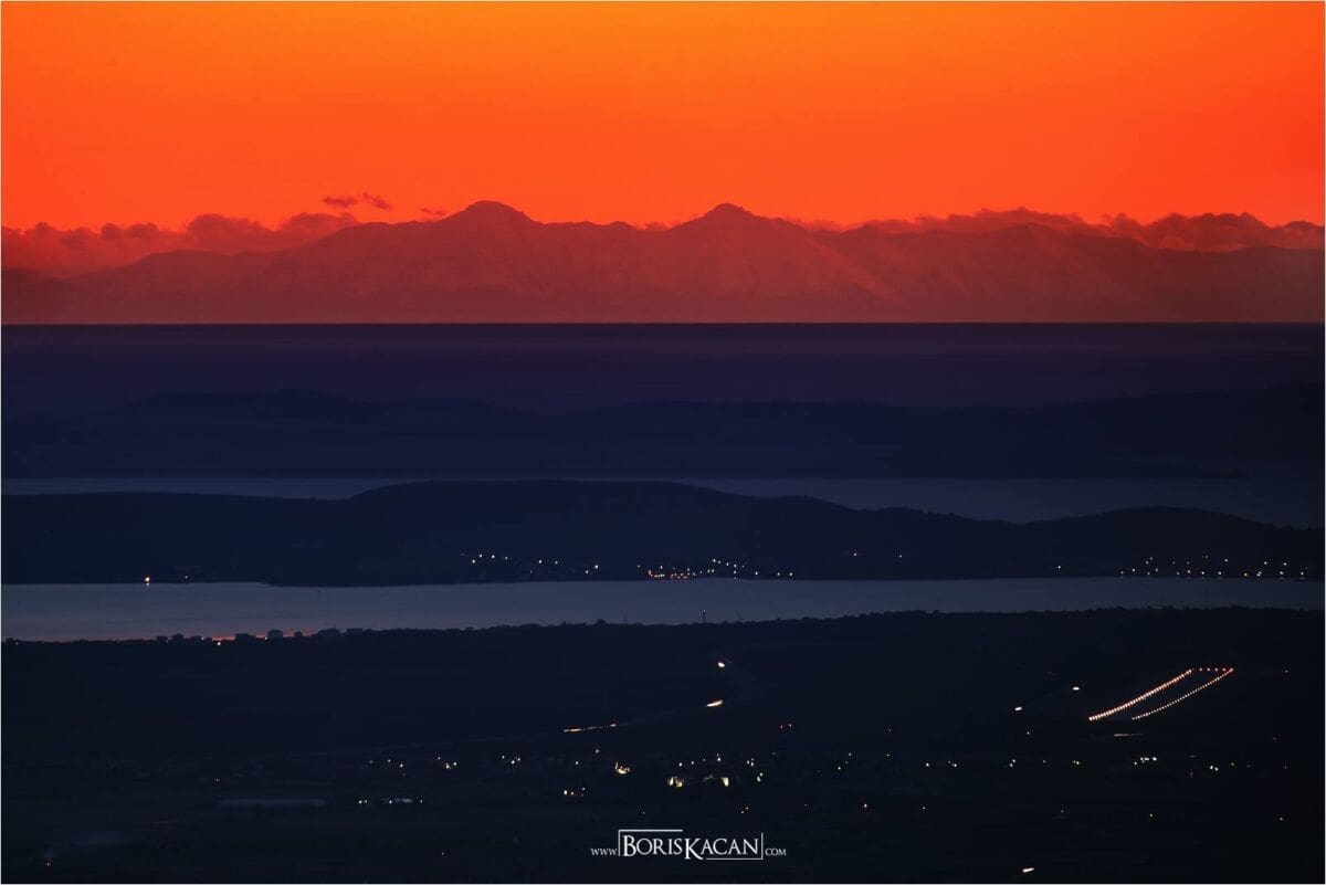 Zadarski fotograf Boris Kačan jučer je u predvečerje snimio zaista fascinantan prizor s južnog Velebita. Naime, nad horizontom je "izronila" Italija, odnosno planinski masiv Apenina. Vidljivost je bila tako dobra da su se jasno mogla razabrati snijegom prekrivena područja najvišeg vrha talijanskih Apenina Corno Grandea koji je visok 2.912 metara nadmorske visine kao i planinskog masiva Gran Sasso.