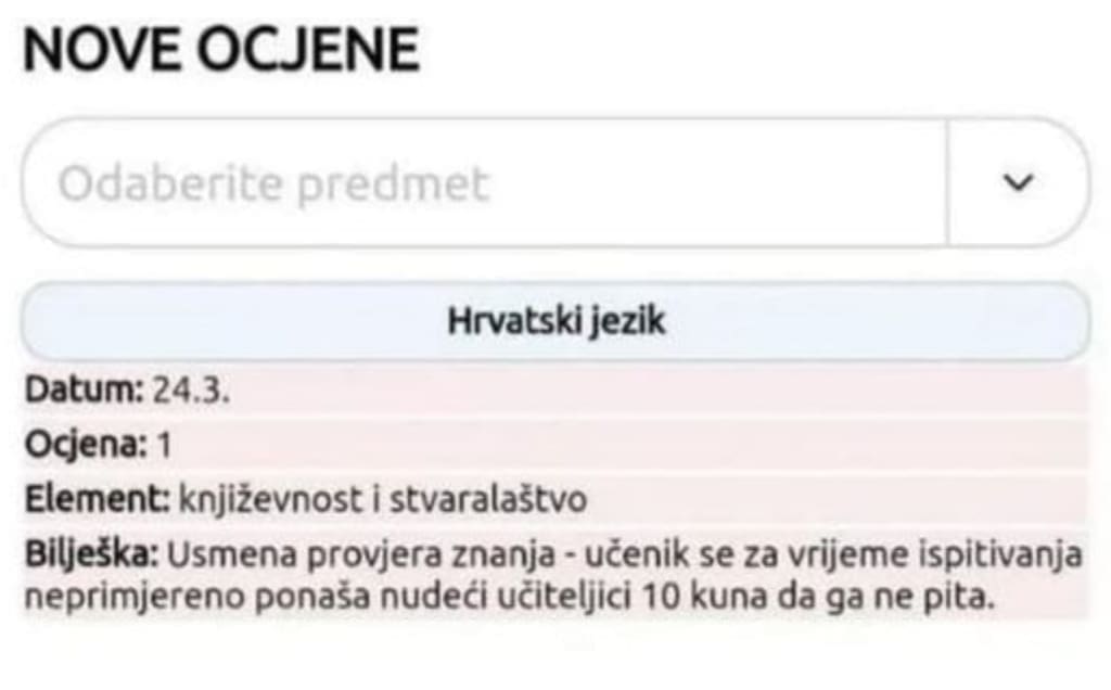 Naime, jedan učenik iz Dalmacije dobio je jedinicu iz Hrvatskoj jezika, no to ne bi bilo posebno zanimljivo u ovoj priči. Neobičan detalj vidljiv je u opisu, odnosno bilješci njegove učiteljice.