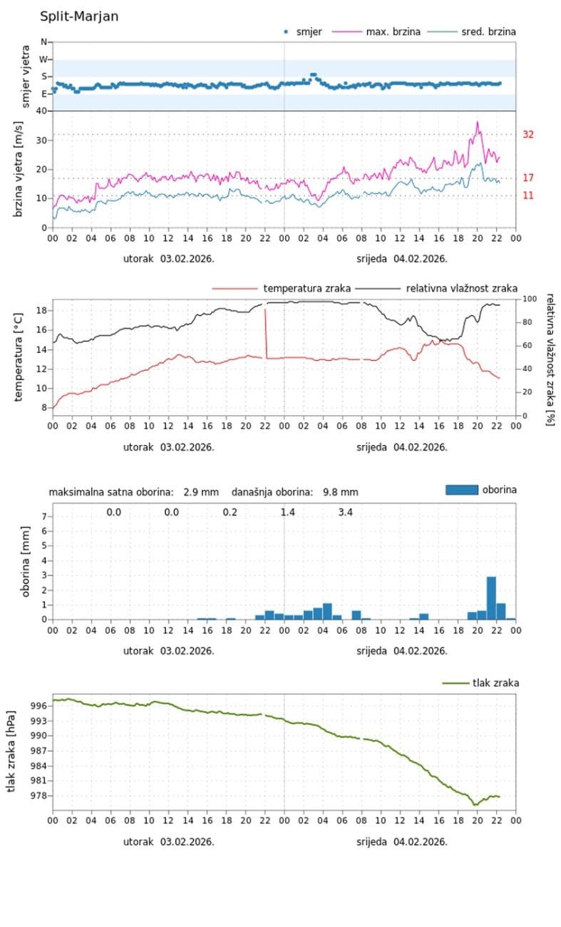 Današnje jugo moglo bi biti treće najjače od početka mjerenja. Spomenimo i da je najviša srednja satna brzina juga iznosila 26.4 m/s, a izmjerena je 21. ožujka 1971. godine.