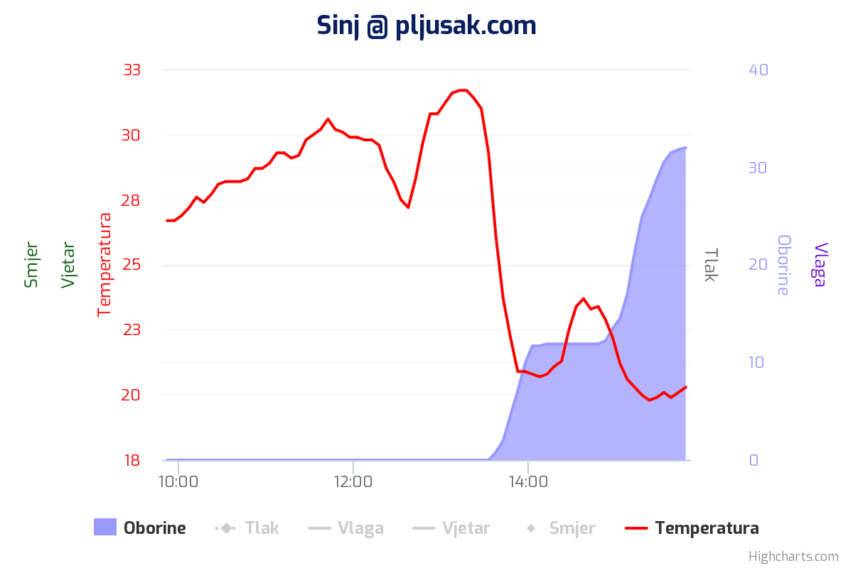 Prema podacima mreže postaja Pljusak.com, od 13 do 16 sati u Sinju su pale čak 32 litre kiše po kvadratnom metru. Na cestama su nastale bujice, što ne čudi pošto se radi o velikoj količini oborina koja je pala u kratkom vremenu. Temperatura zraka se spustila s 33 na samo 19°C i to u samo pola sata.