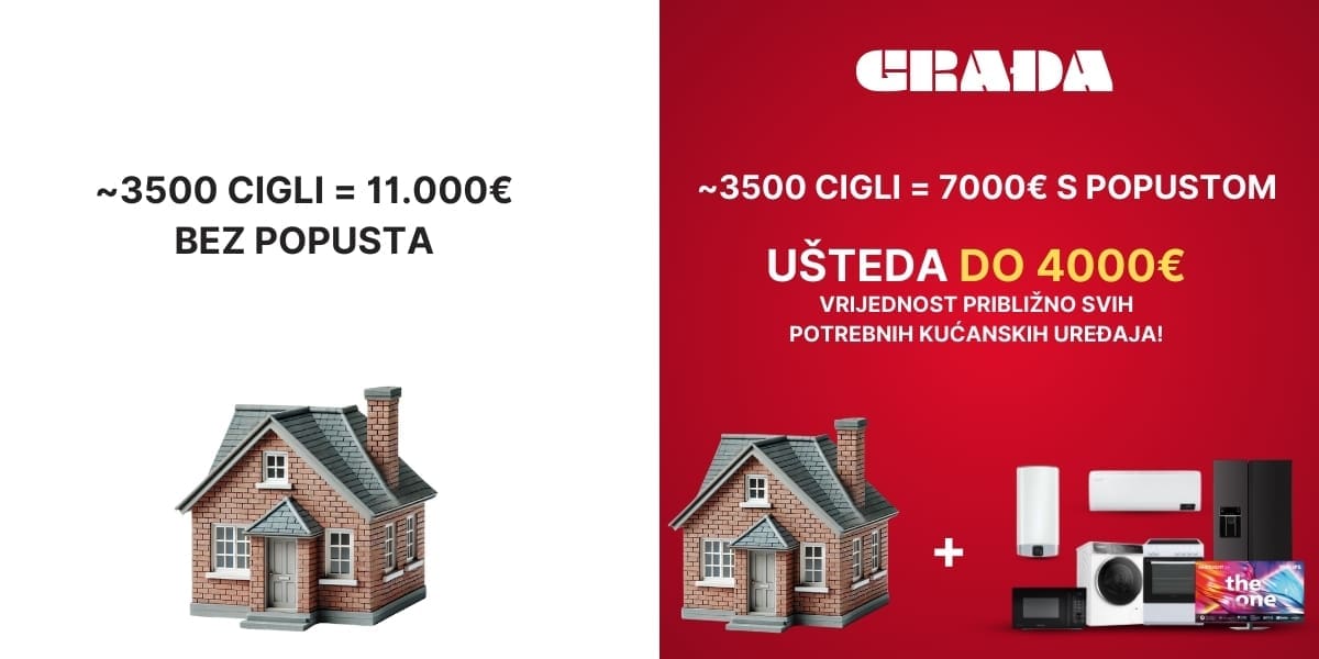 Donosimo vam kratku računicu da bolje predočimo o uštedi! Uzmimo za primjer manje kuće za koju je potrebno otprilike 3500 cigli što može koštati i do 11,000 € bez popusta. U istom primjeru, ako iskoristite već navedene Građine popuste uštedjet ćete i do 4000€, što možete iskoristiti za razne druge građevinske materijale, kućanske uređaje i sl.