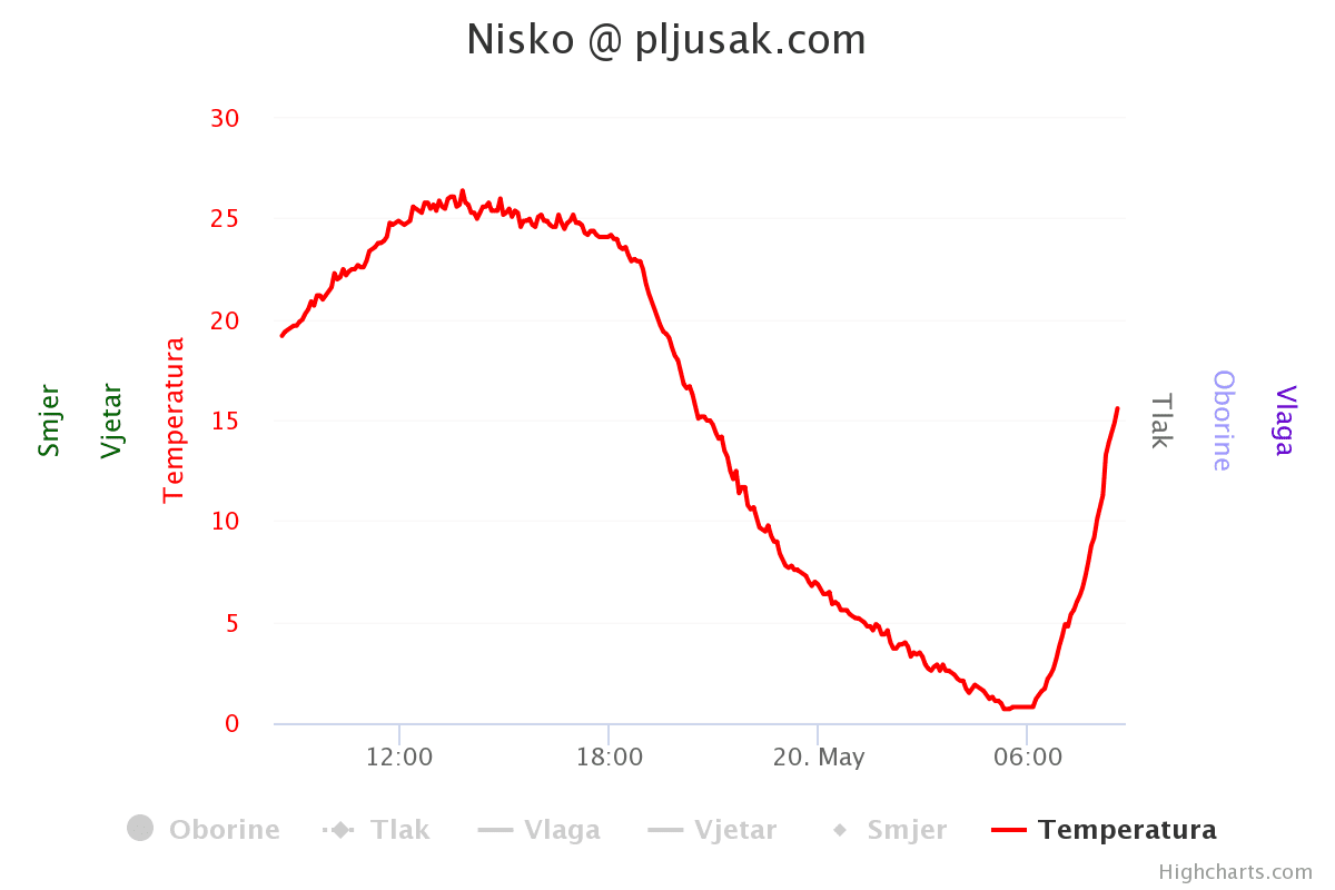 Vinalić kod Peruće i Prugovo mjerili su 2°C, a najhladnije je bilo u Niskome, u kliškoj Zagori, gdje se rano jutros minimalna temperatura zraka spustila na samo +0,7°C što znači da je tamo bilo mraza.