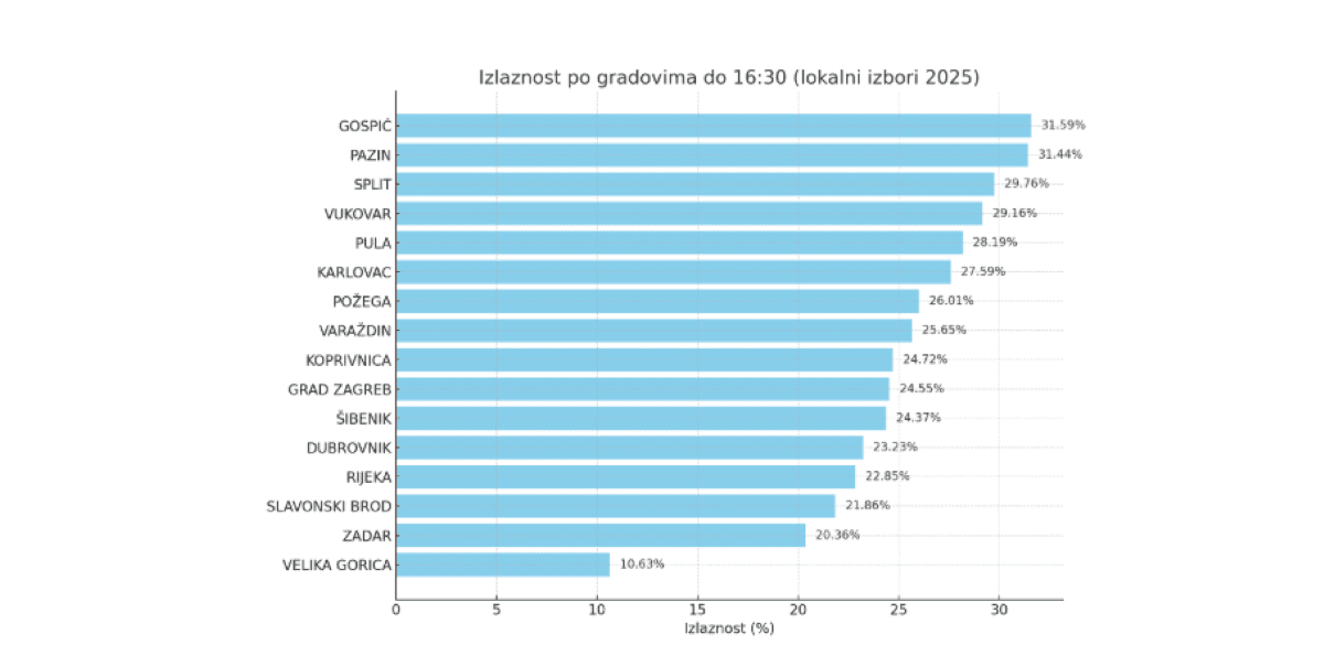 Do 16:30 sati na lokalnim izborima 2025. u gradu Splitu glasalo je 36.306 birača na 145 od ukupno 163 biračka mjesta.