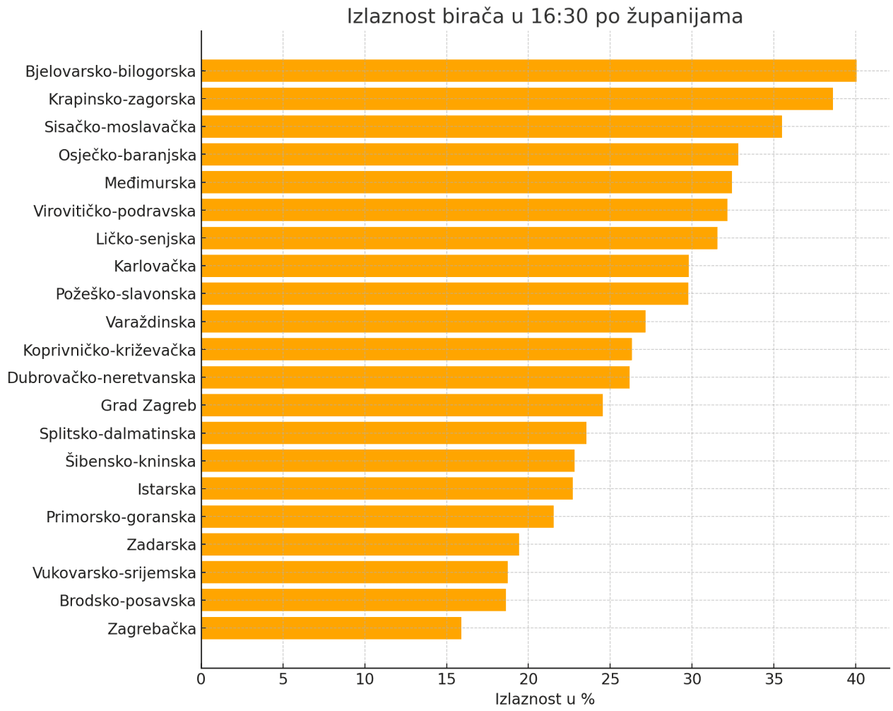 Prema službenim podacima, na tim dojavljenim biračkim mjestima evidentirano je ukupno 122.008 birača, što znači da je izlaznost do 16:30 iznosila 29,76%.