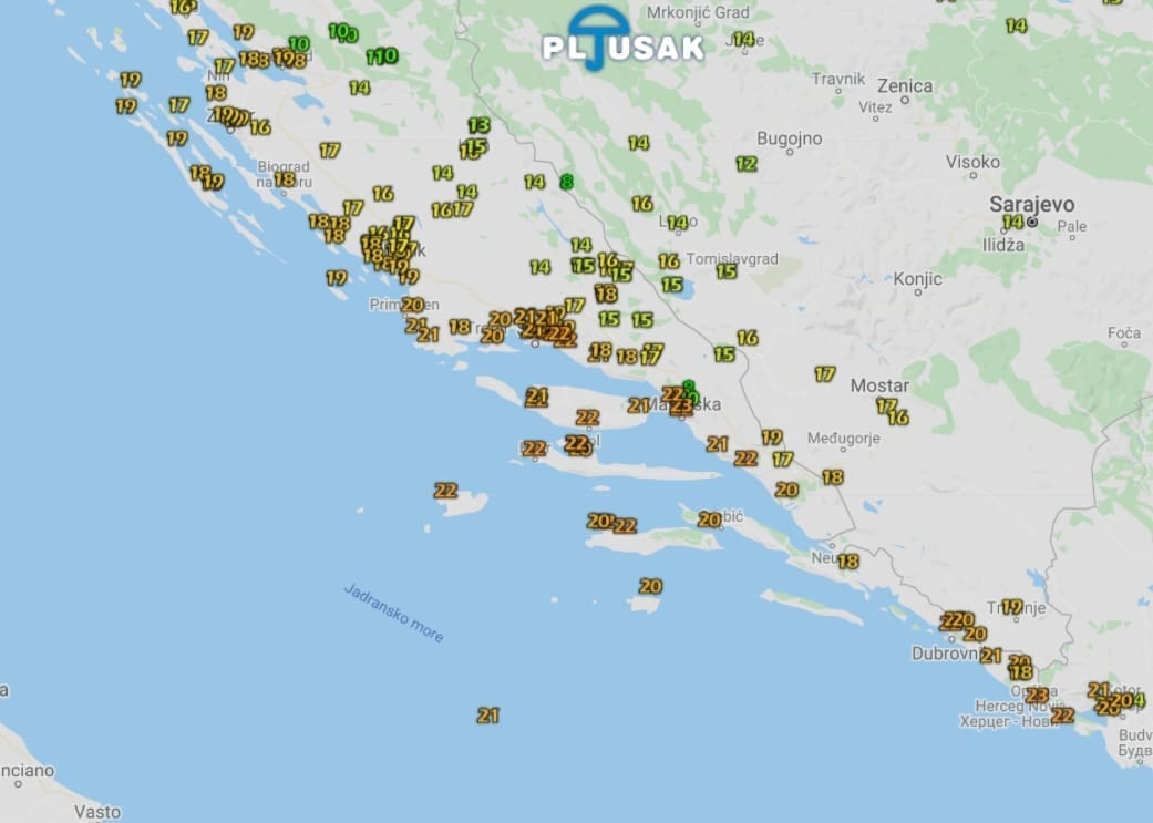 Sredinom noći vladaju poprilične temperaturne razlike pa su temperature zraka od 13°C u okolici Knina do toplih 23°C na makarskom području.