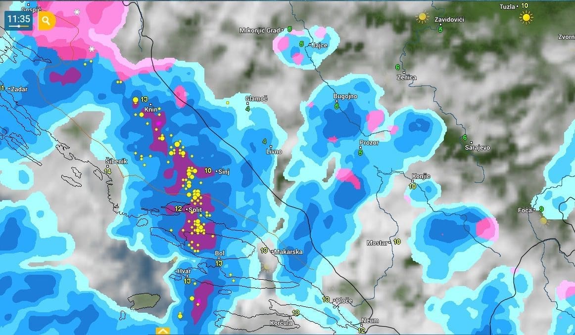 Iza 11 sati jako grmljavinsko nevrijeme zahvatilo je Šoltu i zapadne dijelove Hvara i Brača. Radi se o frontalnom poremećaju koji se u sklopu ciklone danas premješta preko Jadrana. Nevrijeme se potom proširilo na šire splitsko području. Od Kaštela do Stobreča ponegdje je padala tuča. Tuča se u veći predjela nije dugo zadržala i nije izazvala bilo kakvu štetu.