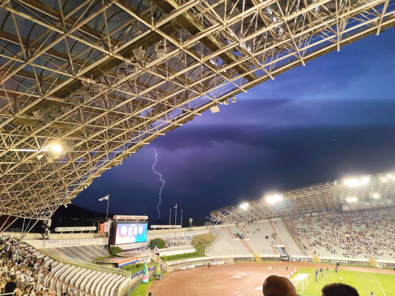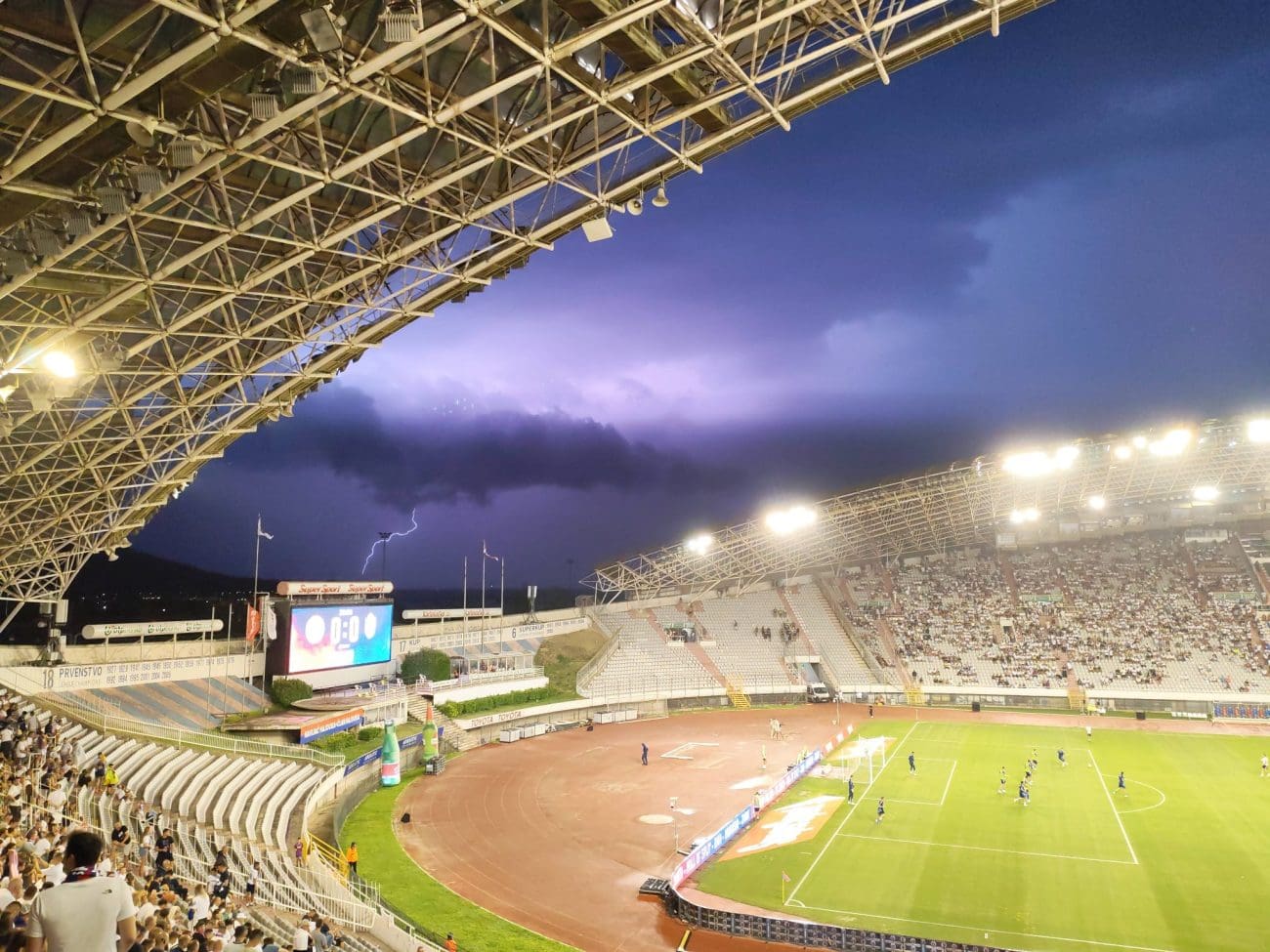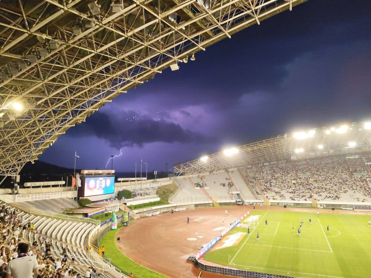 Jako grmljavinsko nevrijeme traje u Splitu, a za to vrijeme publika na Poljudu pjeva "Ništa kontra Splita".