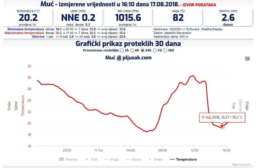 Petak je bio još jedan pravi ljetni dan u Dalmaciji. U većini predjela je bilo suho i pretežno sunčano, ali je u poslijepodnevnim satima došlo do lokalno pojačanog razvoja naoblake. Zbog toga je u dijelovima Dalmatinske zagore bilo pljuskova s grmljavinom.