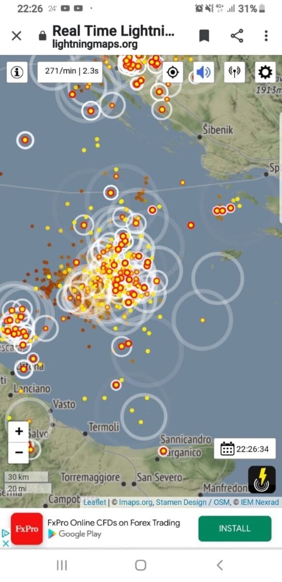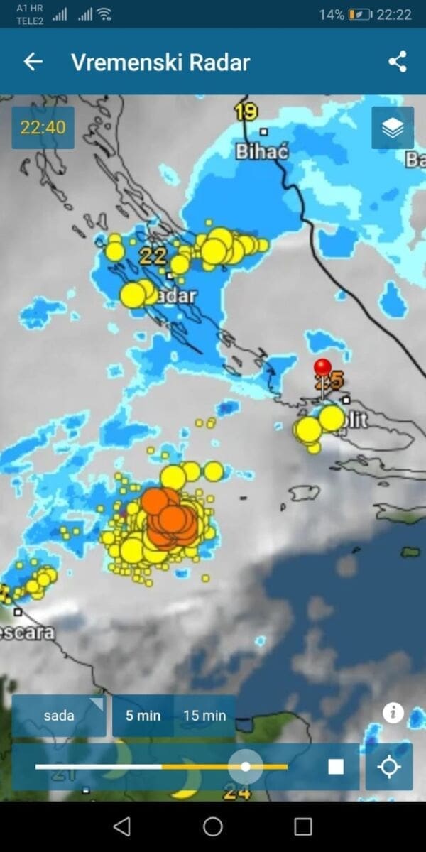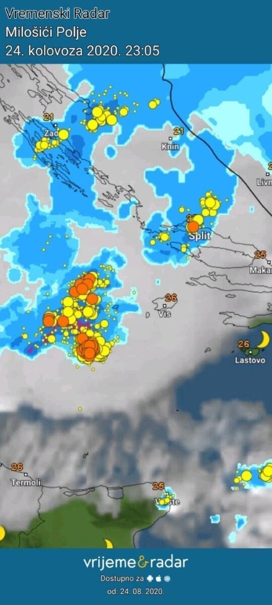 U kasnim večernjim satima grmljavinsko nevrijeme zahvatilo je srednju Dalmaciju. Oblak se prvo razvio nad otvorenim morem, a potom je zahvatio i šire splitsko područje.