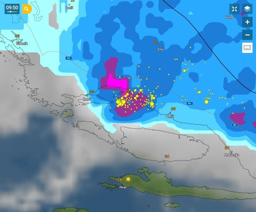 Jutros oko 9.30 sati sa otvorenog mora stiglo je olujno nevrijeme praćeno jakom kišom, grmljavinom, a lokalno je bilo i krupe, primjerice na području Trogira i Čiova. Oko 10 sati nevrijeme je pogodilo i područje Splita.