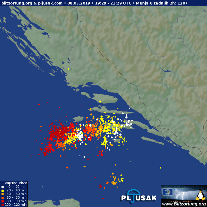 U večernjim satima grmljavinski pljuskovi zahvatili su područja Korčule, Lastova, Palagruže, a nevrijeme se prije 22 sata približilo Visu, ali je glavninom skrenulo preka Korčuli i Pelješcu.