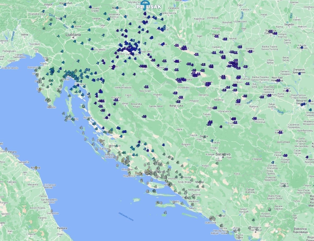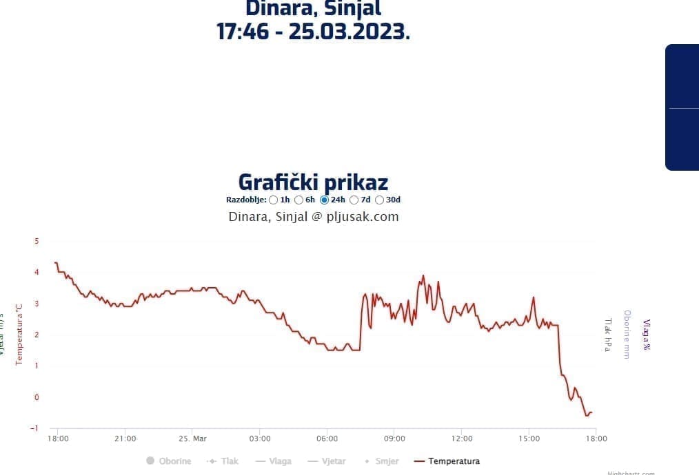 Zanimljiv je raspored temperatura zraka u Dalmaciji u kasnim popodnevnim satima. U 17 sati veći dio obale i otoka mjeri visoke temperature, od 17 do 20°C, a koji sat ranije bilo je i nekoliko stupnjeva toplije. U isto vrijeme, na kninskom području temperature su od 10 do 12°C, a na najvišem vrhu Hrvatske, Sinjalu na Dinari, temperatura je pala na samo -1°C uz povremeno padanje snijega.