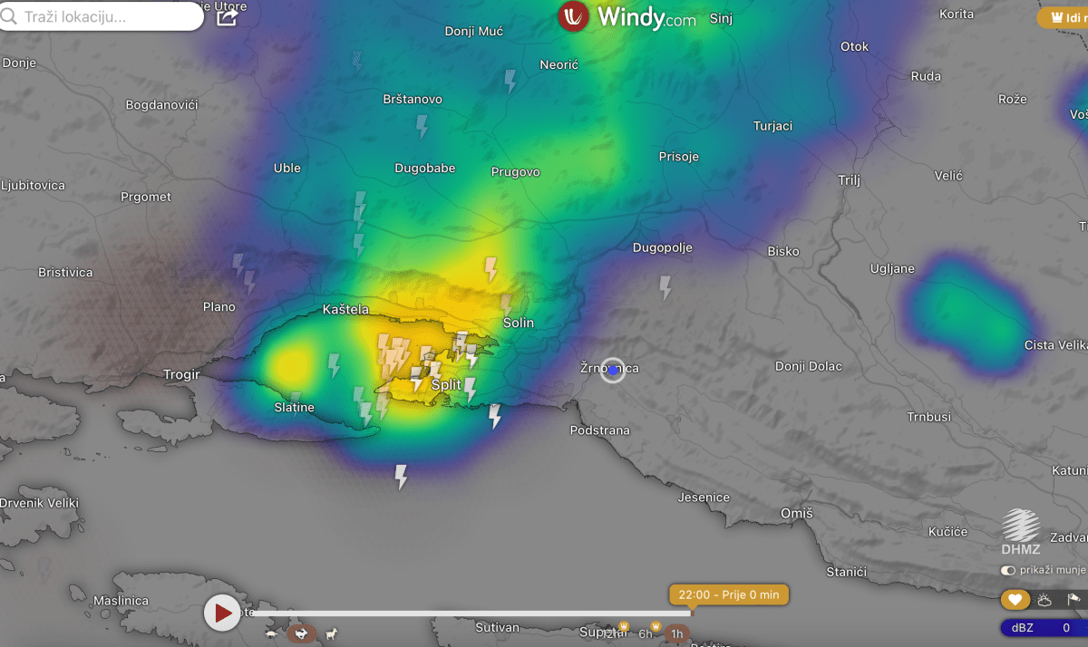 U večernjim satima grmljavinsko nevrijeme zahvatilo je šire splitsko područje. U samo 30 minuta u dijelovima Trogira i Kaštela palo je 15 litara kiše po metru kvadratnom. Oko 22 sata nevrijeme zahvatilo i sam Split.