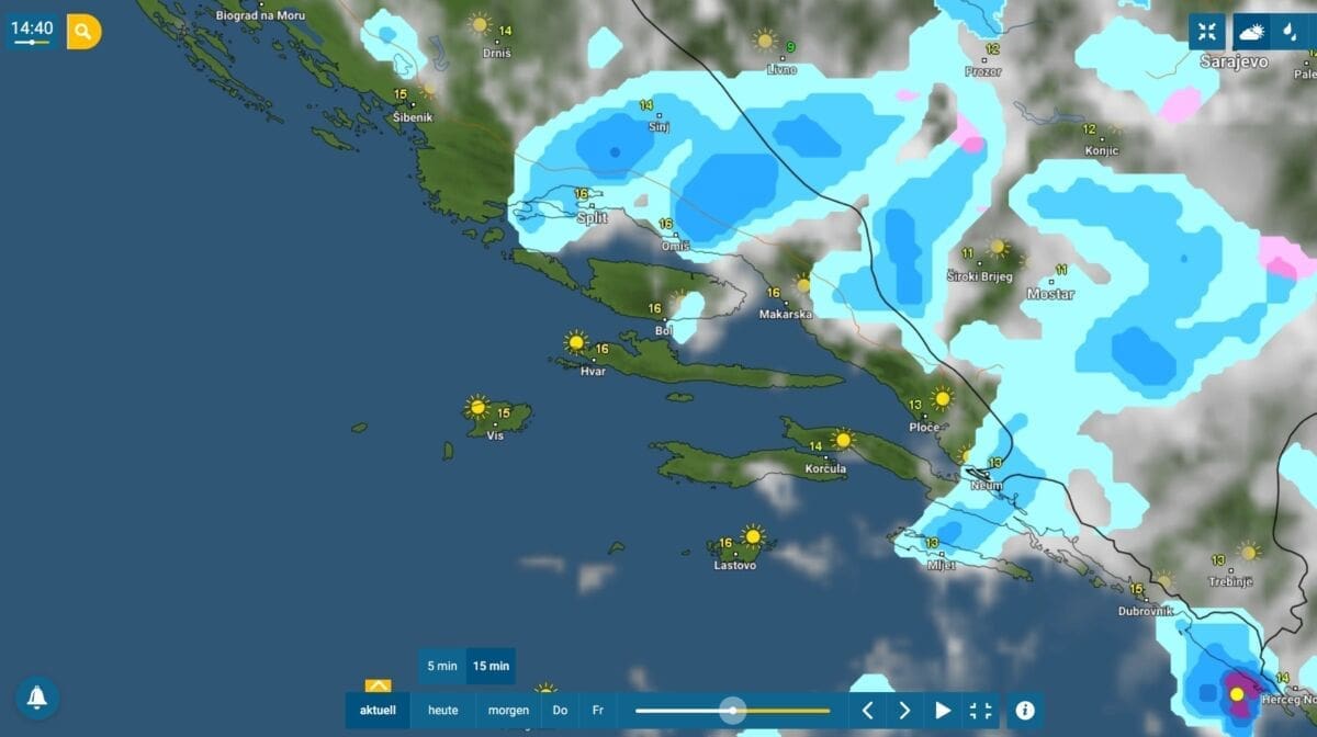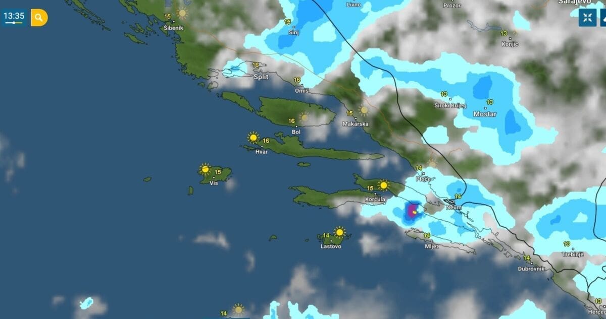Blizina visinske ciklone uvjetuje lokalno jak razvoj oblaka od sredine dana. Najjači grmljavinski pljuskovi pojavili se se nad Korčulom i Pelješcem. Prema podacima mreže postaja Pljusak.com, u Korčuli je za samo pola sata palo 14 litara kiše po kvadratnom metru.