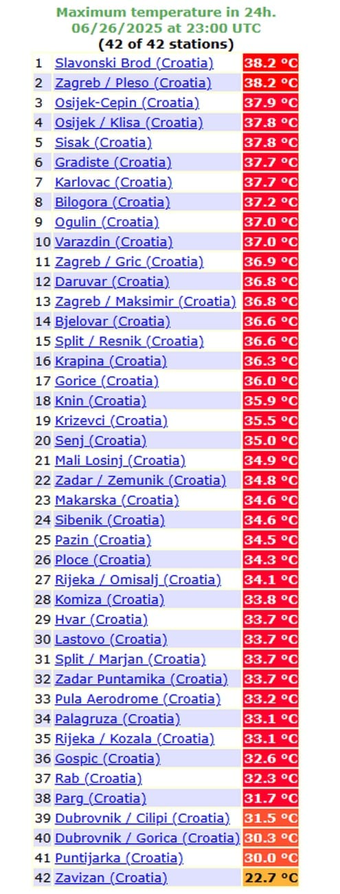 Kako je i najavljeno, Hrvatsku je zahvatio toplinski val, a jučer, 27. lipnja, zabilježeno je više novih lipanjskih apsolutnih temperaturnih rekorda. Rekordne ili skoro rekordne temperature mjerene su u istočnim i središnjim krajevima zemlje, ali i ponegdje na obali.