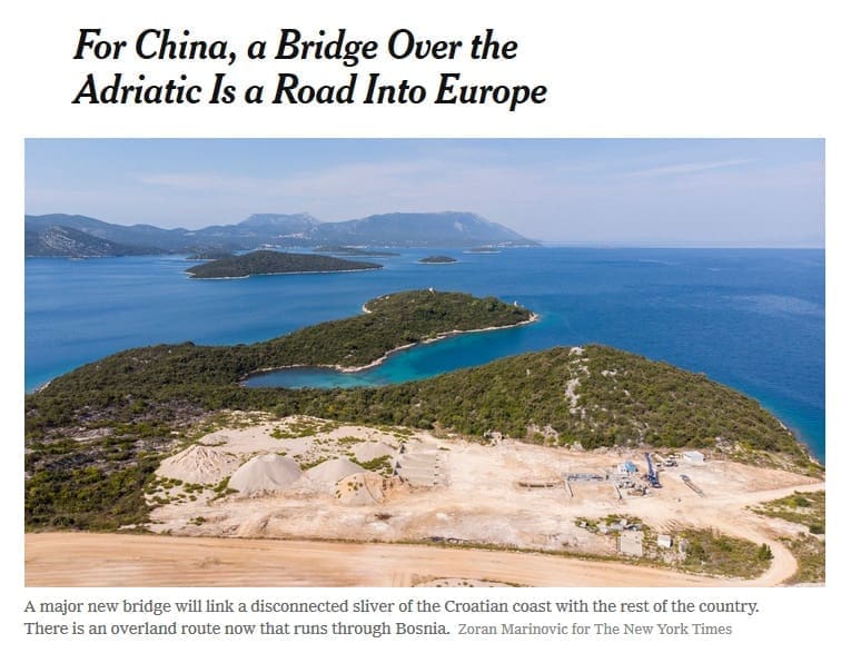 New York Times se pozabavio pričom o Pelješkom mostu i ulozi koju će u preko gradnje mosta za EU imati Kinezi, odnosno izvođači radova, tvrtka China Road and Bridge Corporation, navodeći da je most preko Jadrana, za Kinu most u Europu.