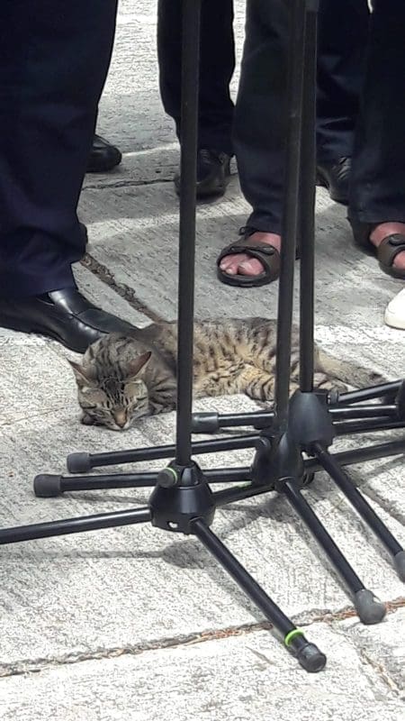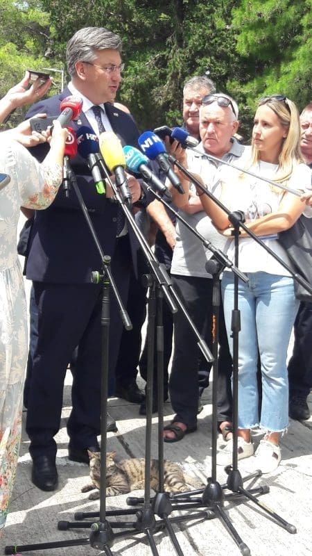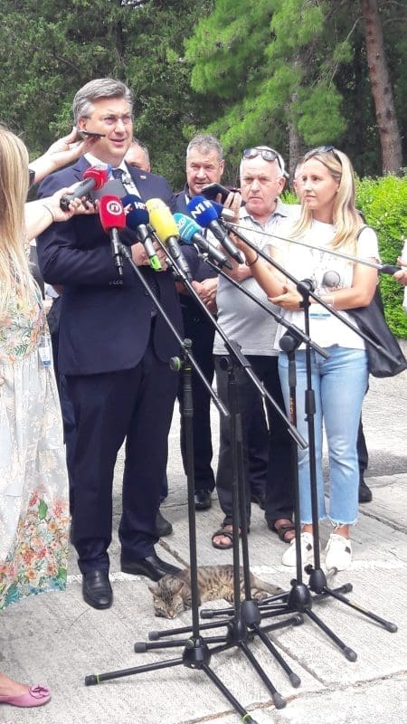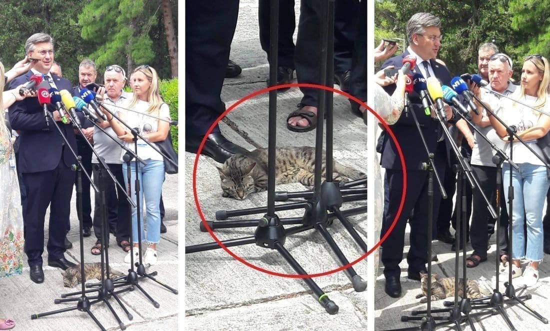 Zanimljivu fotografiju snimila je naša reporterka. Naime u trenutku dok je premijer Plenković davao izjave medijima, jedna mačka je pronašla svoje mjesto odmah ispod mikrofona.