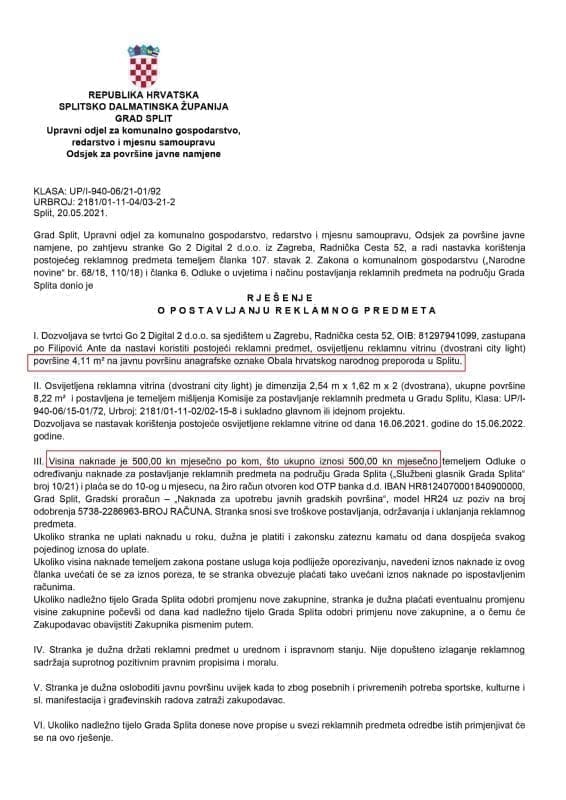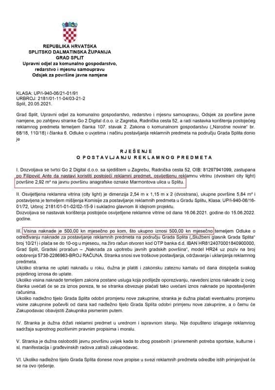 Evo primjera starog sedam (7) godina. Daleke 2015. tadašnji Gradonačelnik se složio da se na Rivu i u Marmontovoj postave svijetleći LED paneli za oglašavanje. Kako u Odluci o komunalnom redu takva naprava nije opisana, a najbliže opisu je bio tzv. city ligt reklamna vitrina u kojoj je nekoć stajao tiskani plakat koji se mijenjao s vremena na vrijeme tako se cijena obračunavala po kvadratu i za zakupnika javne površine iznosila je „teško plativih“ 500 kuna mjesečno. I tako punih sedam godina grad po komadu dobiva fantastičnih 500 kuna mjesečno. A trebalo je samo izmijeniti Odluku o komunalnom redu, opisati napravu i odrezati pravičnu naknadu.