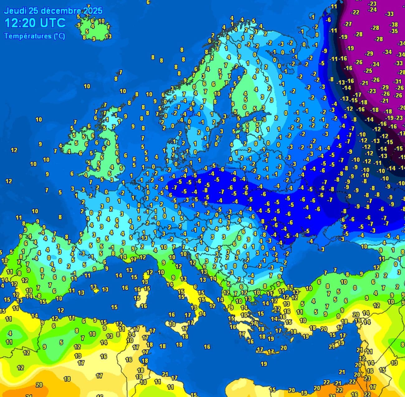 Temperaturna situacija danas, tijekom sredine dana u Europi, jasno pokazuje poduži kontrast između toplijih zapadnih i sjevernih područja te hladnih istočnih krajeva: