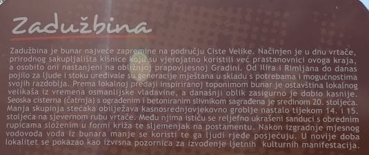 Lokalitet Zadužbina (bunar) kod Ciste Velike smješten je u udubinu te ga je nemoguće vidjeti iz daljine nego jedino iz zraka ili blizine tako da ni mnogi Cišćani nisu znali (zbog zapuštenosti) da postoji takva povijesna vrijednost u njihovom mjestu. U posljednje vrijeme su ga otkrili izletnici, a dio njih toliko poštuju povijest da u njega bacaju plastične boce.