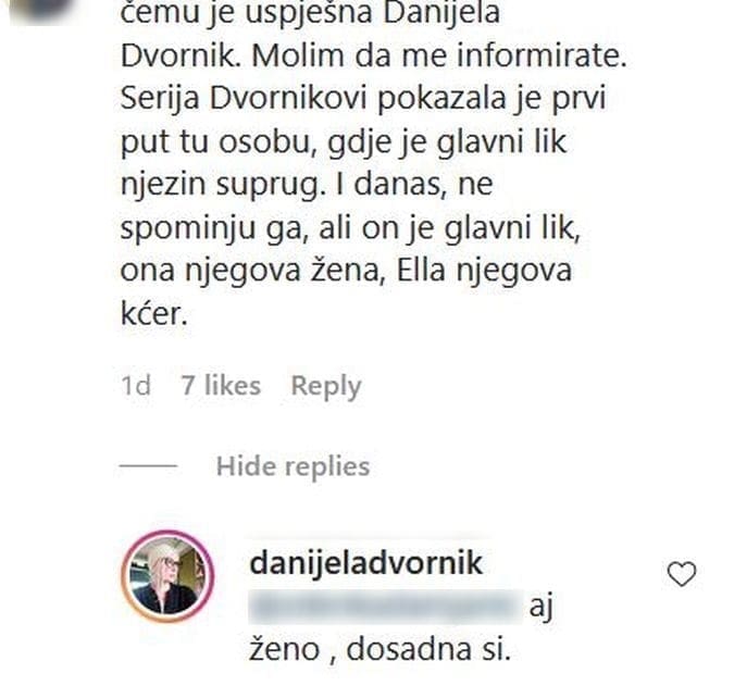 "Ne znam po čemu je uspješna Danijela Dvornik. Molim da me informirate. Serija 'Dvornikovi' pokazala je prvi put tu osobu, gdje je glavni lik njezin suprug. I danas, ne spominju ga, ali on je glavni lik, ona njegova žena, Ella njegova kći", napisala je.
