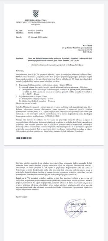 Iako je prilikom prijave projekta bio dosta skeptičan po pitanju prolaska i odobrenja projekta, obzirom na sistem bodovanja, solinski gradonačelnik Dalibor Ninčević kaže da se danas vrlo ugodno iznenadio obavijesti o statusu projektnog prijedloga temeljem kojeg se Gradu Solinu za izgradnju vrtića u Sv. Kaju dodjeljuje 𝟱.𝟱 𝗺𝗶𝗹 𝗸𝘂𝗻𝗮 iz NPOO-a.