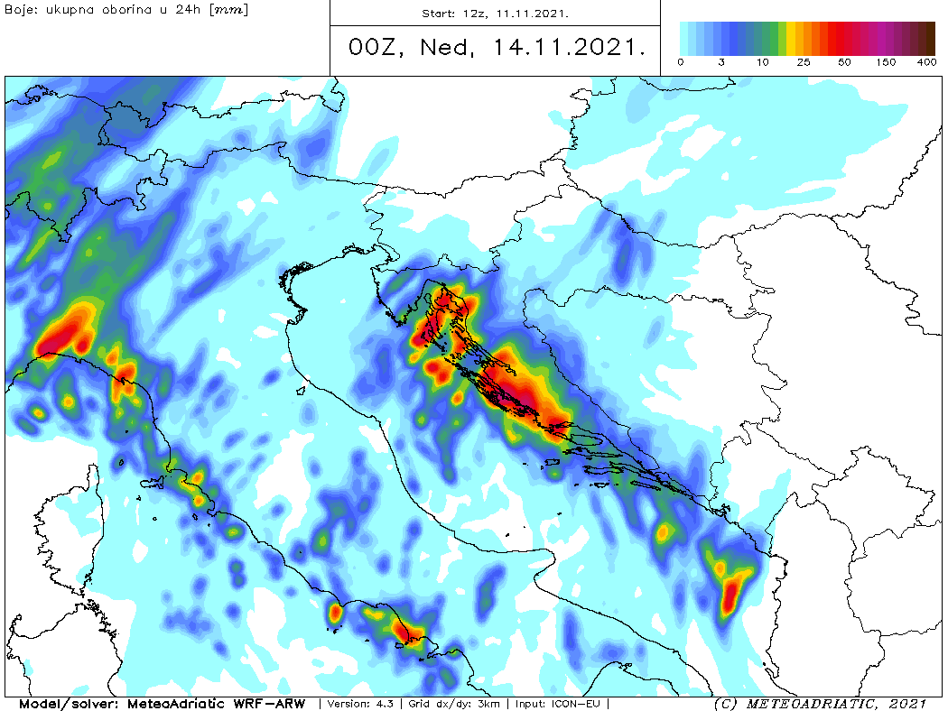 Pretežno oblačno će biti i u nedjelju. Povremeno će biti kiše, više na moru, a manje na kopnu. Na moru su mogući i pljuskovi s grmljavinom. Veći dio dana umjereno, na moru i jako jugo, navečer će biti u slabljenju. Najviše dnevne temperature većinom od 15 do 20°C.