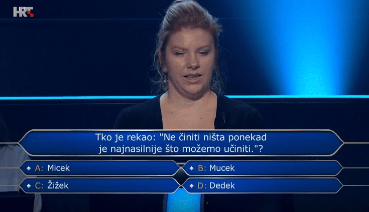Na 8. pitanju znao je odgovor o tome tko je napisao roman o kockanju da otplati svoje kockarske dugove: Tolstoj, Turgenjev, Nabokov ili Dostojevski. Odgovor Dostojevski donio mu je 8000 kuna.