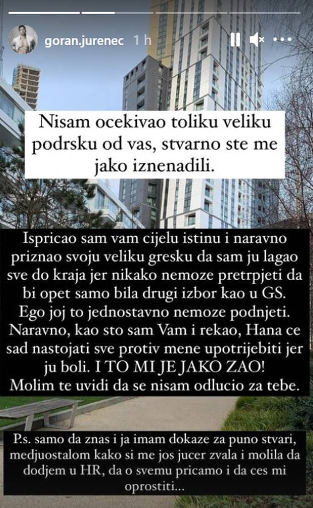 Goran tvrdi da Hana ne može podnijeti što je ponovno kao i u showu postala drugi izbor. Kaže da ga je Rodić još jučer molila da dođe u Zagreb i da sve izglade. U nastavku storyja na Instagramu pale su još teže riječi.