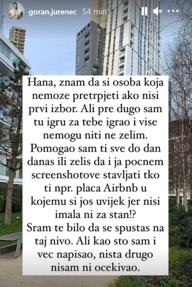 Goran tvrdi da Hana ne može podnijeti što je ponovno kao i u showu postala drugi izbor. Kaže da ga je Rodić još jučer molila da dođe u Zagreb i da sve izglade. U nastavku storyja na Instagramu pale su još teže riječi.