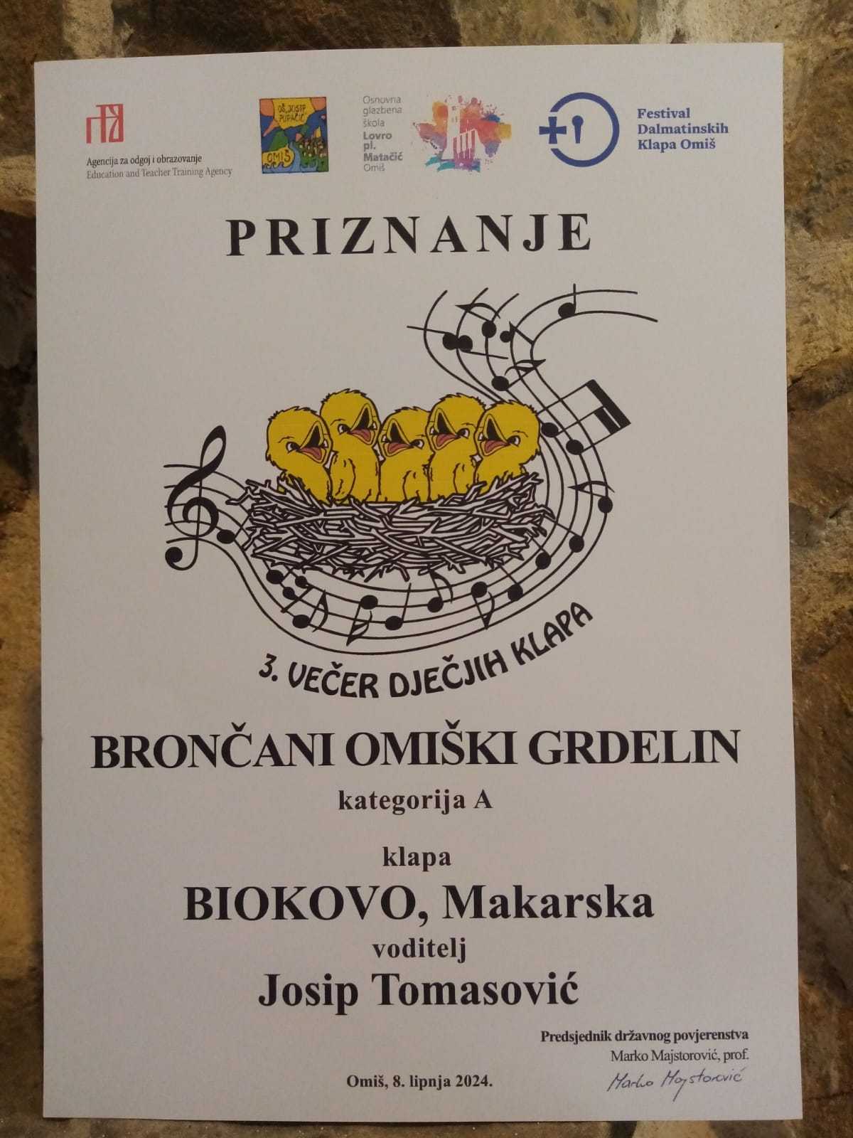 Upravo spojem ljubavi i obrazovanja, 2022., pri Osnovnoj školi „Stjepana Ivičevića“ u Makarskoj, osnovana je dječja klapa 'Biokovo' koja broji 14 članova. Luka Erceg, Mirta Bušelić, Linda Kovačević, Vedrana Nemčić, Lucija Čović, Anamaria Kusić, Lara Musulin, Karlo Čip, Karlo Vlaho, Frane Varenina, Lucija Mihnjak, Tonći Jakir, Ana Šapit i Ana Koprivnić pod vodstvom nastavnika Josipa Tomasovića pobiru ovacije i nagrade gdje god se pojave.