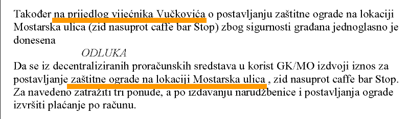 Nije istina da je HDZ uspješno realizirao zaštitnu ogradu u Mostarskoj ulici. U zapisniku s VIII sjednice Vijeća kotara Neslanovac od 19.3.2015. na drugoj stranici jasno se vidi da je spomenuta ograda napravljena na prijedlog nezavisnog vijećnika Darka Vučkovića. Originalni zapisnik možete pogledati na adresi http://bit.ly/Zapisnici_VK