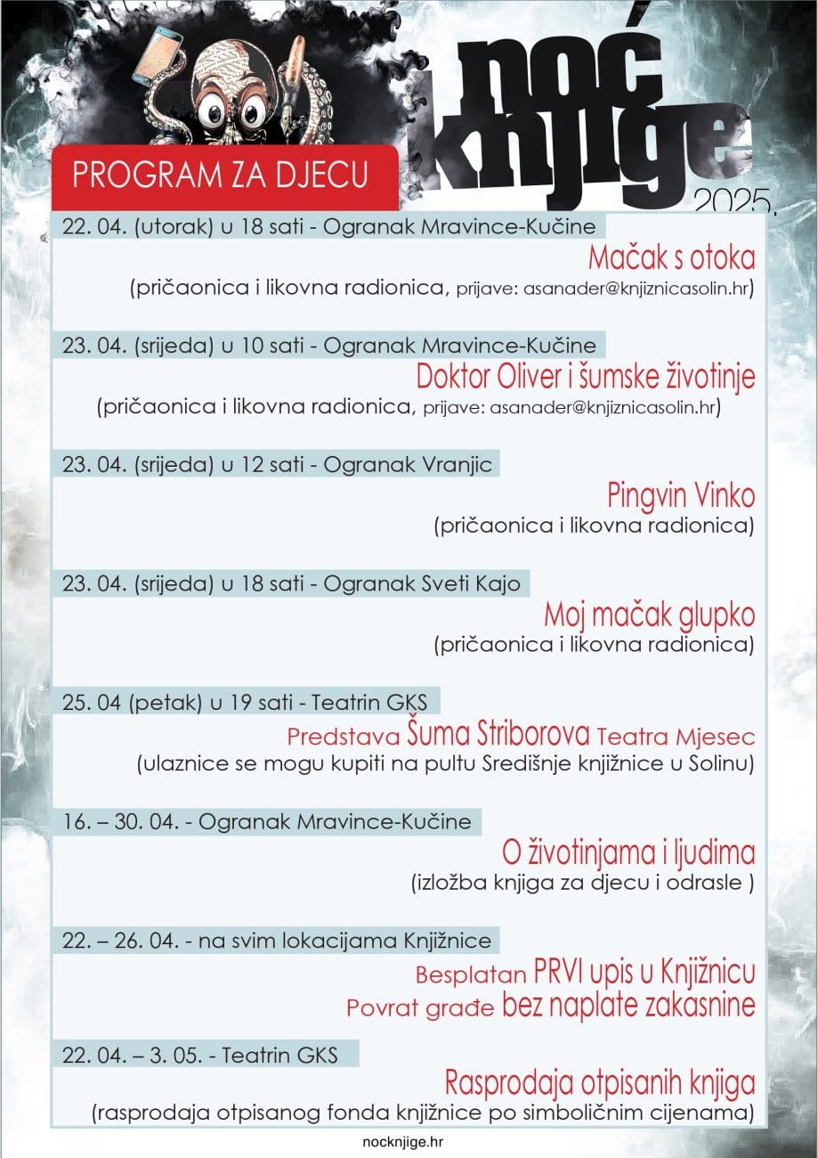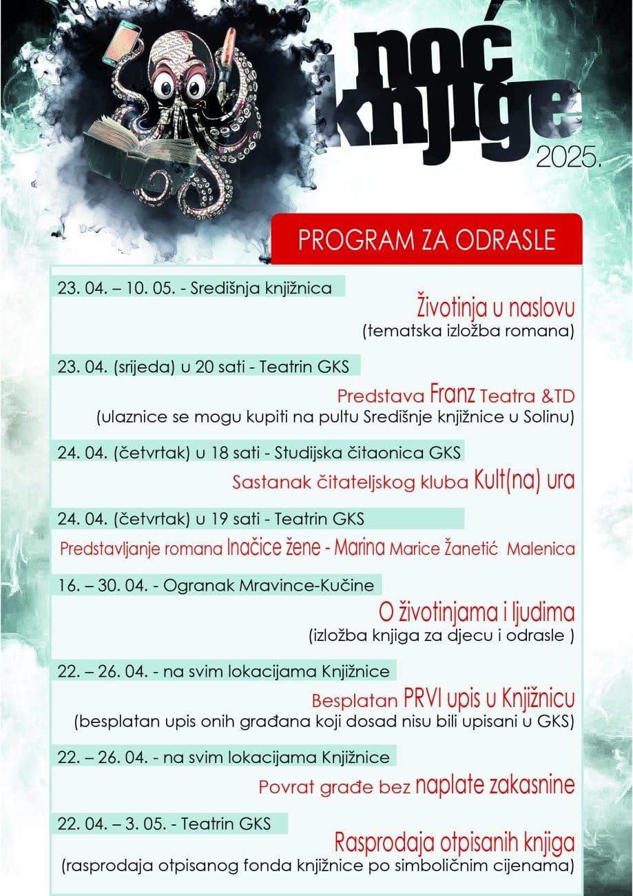 Pod motom "O životinjama i ljudima", ovogodišnja Noć knjige donosi bogat i raznolik program i u Gradskoj knjižnici Solin, gdje su i ove godine pripremljeni brojni sadržaji za djecu i odrasle. Manifestacija traje cijeli tjedan, a obuhvaća izložbe, radionice, predstave i popuste – sve u znaku ljubavi prema knjizi.