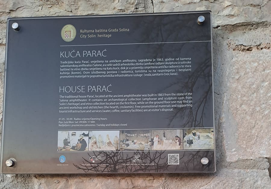 Na počeku programa je otvorena tradicijska Kuća Parać koju je Grad Solin ustupio na korištenje Arheološkom muzeju u Splitu za potrebe obavljanja arheoloških radova te za prihvat posjetitelja. Kuća je sagrađena 1863. godine, a smještena je na ostacima sjevernog dijela antičkog amfiteatra.
