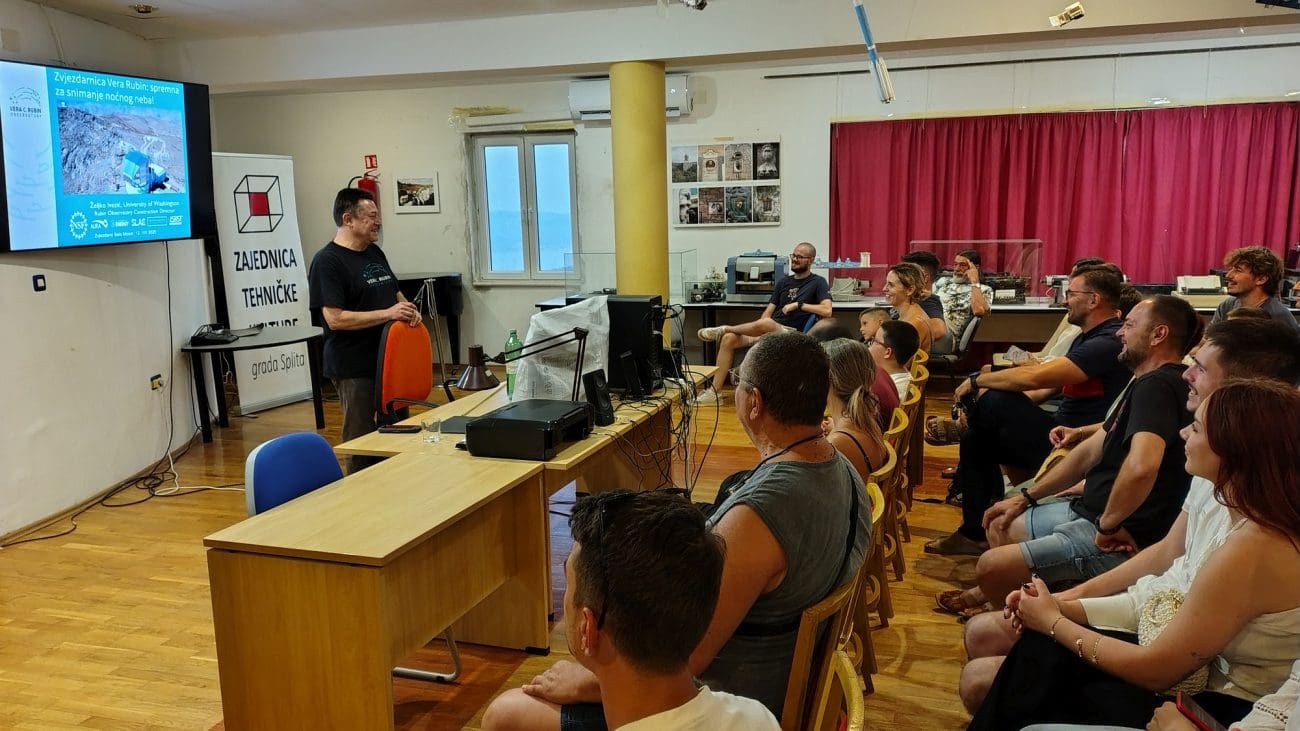 Prof. Ivezić je predavač na Sveučilištu Savezne države Washington i od 2021. g. voditelj izgradnje Zvjezdarnice Vera Rubin u Čileu. Njegovo nadasve zanimljivo predavanje, koje je unatoč obilju iznesenih tehničkih pojedinosti bilo lako razumljivo i prosječnom zvjezdoljupcu, ticalo se upravo izgradnje, svrhe i svojstava toga prvorazrednog opservatorija, kao i prvih rezultata ostvarenih iz njega. Po okončanju predavanja, prof. Ivezić je odgovorio i na nekoliko intrigantnih pitanja, poput onoga kako na opserviranje utječe ogromno mnoštvo novih satelita ili onoga o tome zašto je za refleksivni sloj primarnog zrcala izabrano srebro i može li taj sloj biti zaštićen nekom vrstom premaza.