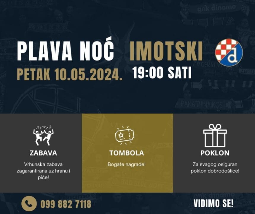 "Po prvi puta u Imotskom organizira se Plava noć za sve ljubitelje i simpatizere GNK Dinama Zagreb!", objavio je Radio NU.