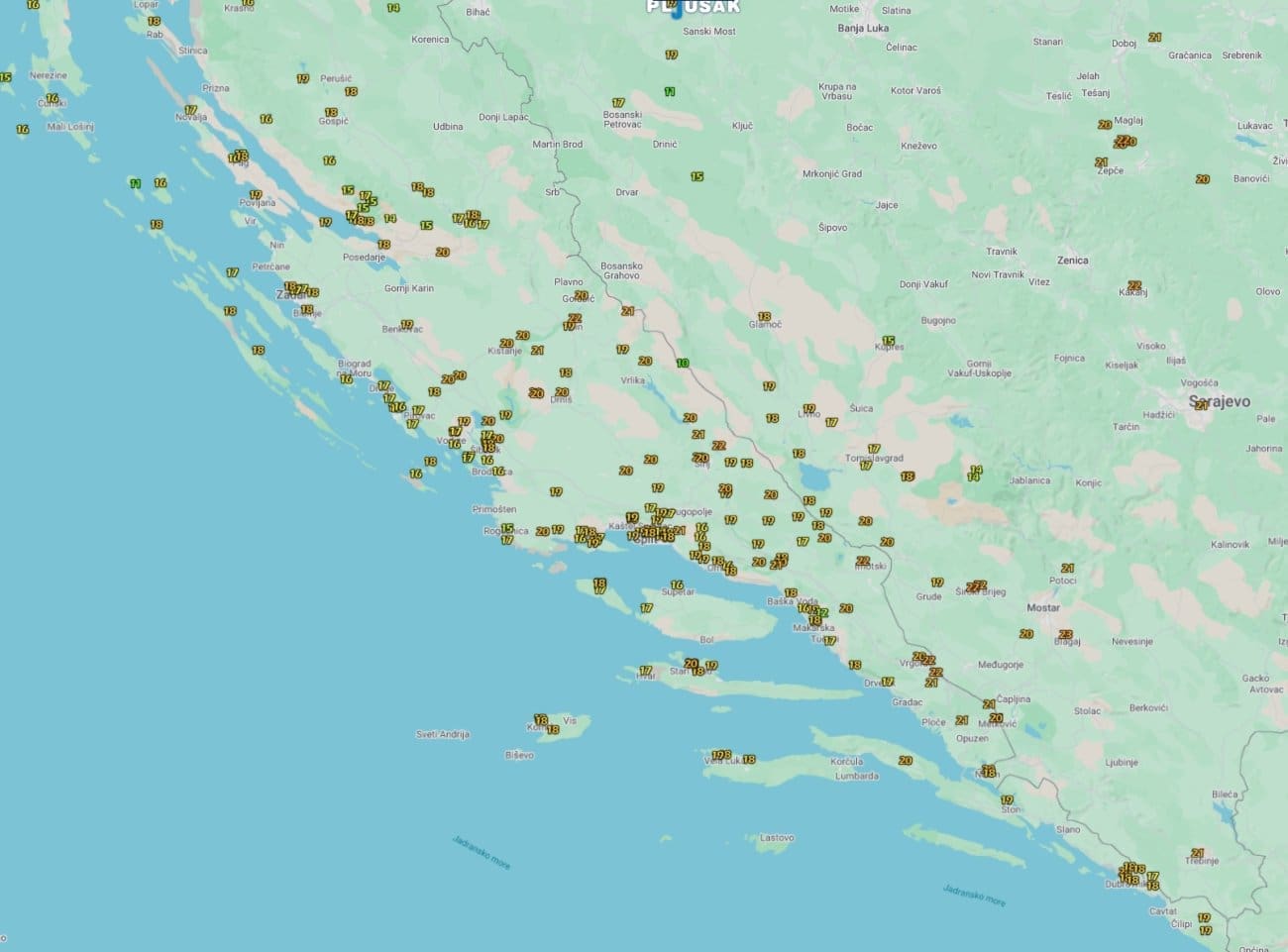 Sinj u isto vrijeme mjeri 4 stupnja, a Velika Duvjakuša na Dinar, na 1630 metara +6. Podproglog kod Vrgorca mjeri 3 stupnja, a Vrgorac +10. Primjera ima još mnogo.