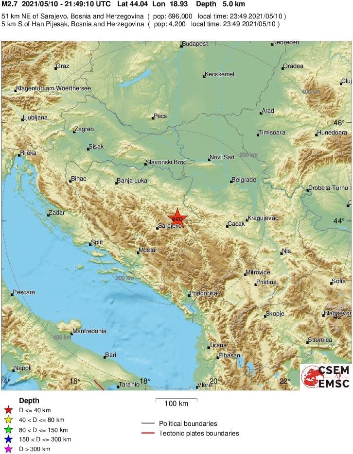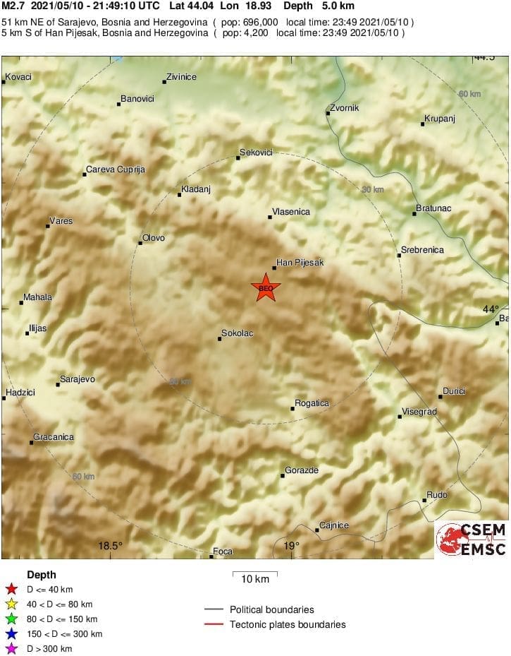 U ponedjeljak kasno navečer potres slabijeg intenziteta zabilježen je u susjednoj BiH.