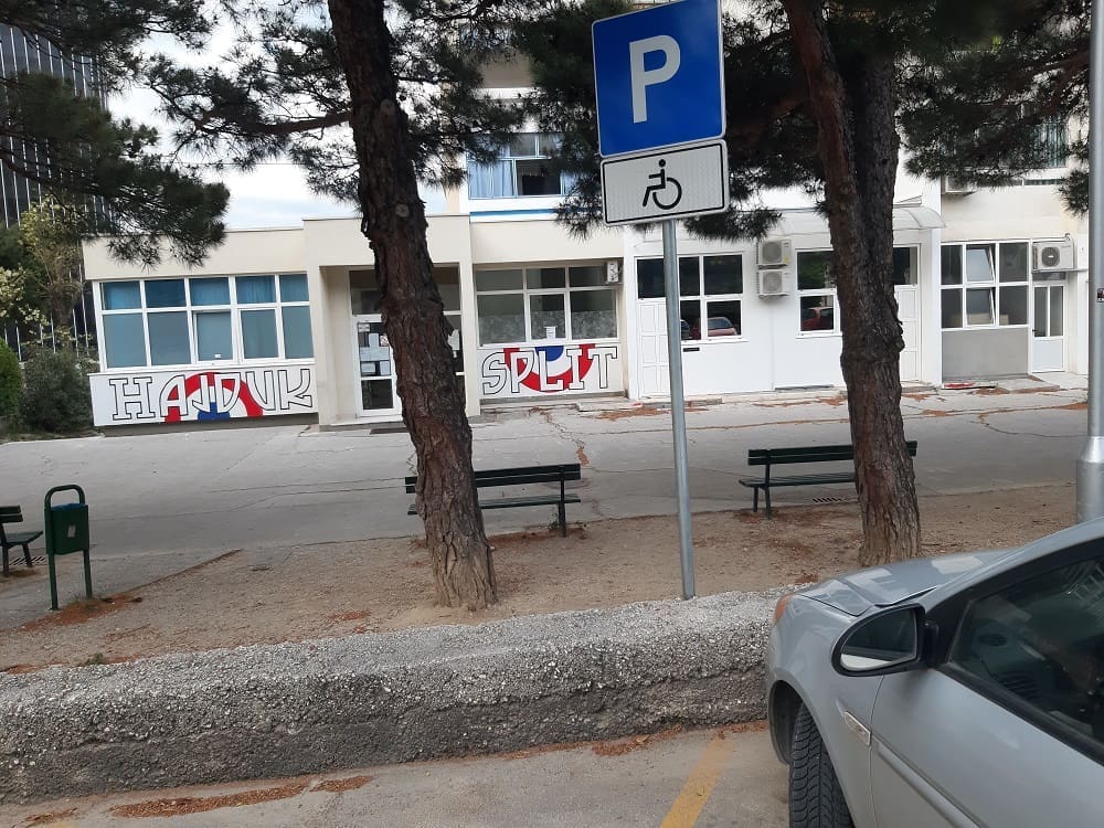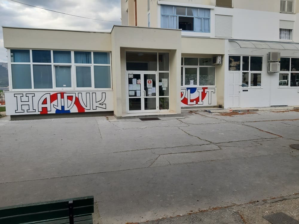 S obje strane obje, cijelom dužinom pročelja, na odličnom i temeljito oslikanom muralu piše – Hajduk Split.