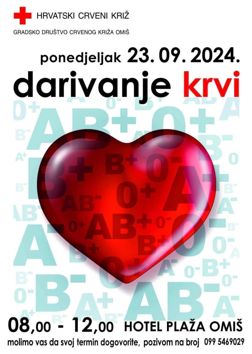 23. rujna (ponedjeljak) Gradsko društvo Crvenog križa Omiš organizira akciju darivanja krvi. Akcija će se održati u hotelu "Plaža" Omiš od 8 do 12 sati.
