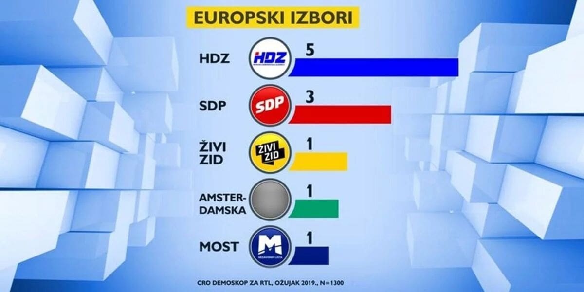 U mandatima HDZ osvaja 5, SDP 3, Živi zid i Amsterdamska koalicija po jedan mandat. HDZ je na prošlim EU izborima osvojio 6 mandata, ali su izašli u koaliciji, pa je u parlament zapravo ušlo četvero HDZ-ovaca, plus Marijana Petir i Ruža Tomašić. U koaliciji je bio i SDP, pa iako su osvojili 4 mandata samo dvoje su SDP-ovci.