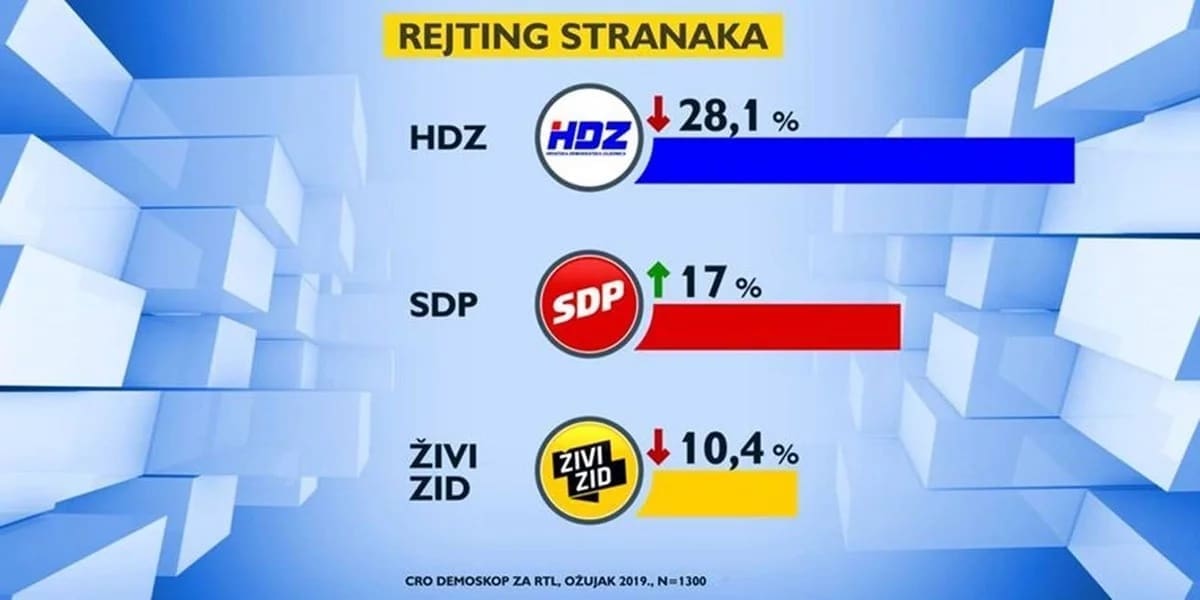 HDZ i dalje uvjerljivo vodi. Iako bilježi manji pad od prošlog mjeseca njih bi odabralo 28,1 posto ispitanika (prema 28,4 posto iz veljače). SDP je nakon sedam mjeseci zaustavio negativni trend, narastao je od veljače nešto preko jednog postotnog poena i sada je na 17 posto (prema 15,8 posto iz veljače). No, i dalje kaska za rejtingom prošlogodišnjeg ožujka. Živi zid drugi mjesec zaredom bilježi pad, ali ovaj je znatno blaži. Njih bira 10,4 posto ispitanika (prema 10,9 posto iz veljače).