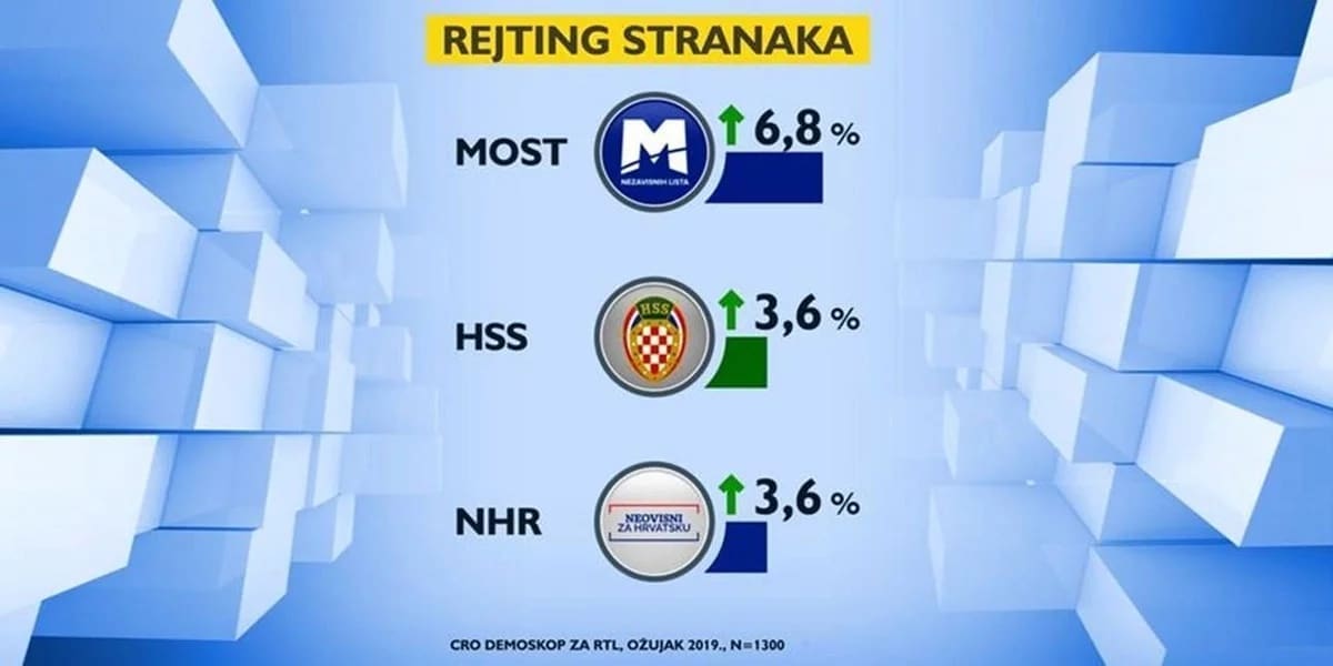 Iste postotke i sličan rast bilježi HSS (u veljači 3,2 posto) i Neovisni za Hrvatsku (u veljači 3,3 posto) s potporom od 3,6 posto.