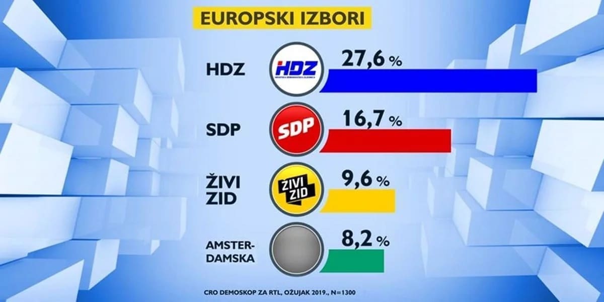 I u prvom ovogodišnjem istraživanju o preferencijama građana za Europske izbore najbolje prolazi HDZ. Sredinom godine, kada se održavaju europski izbori, prema rezultatima bi mogli slaviti, a zadovoljan bi mogao biti i SDP. HDZ bira 27,6 posto, SDP je obabir 16,7 posto, Živi zid 9,6, a Amsterdamsku koaliciju, koja je predstavila svoju listu za EU izbore, bira 8,2 posto.