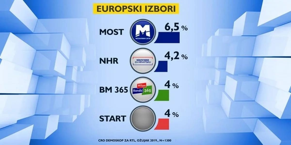 Od manjih stranki u Europski parlament bi prvi put mogao ući MOST. Bira ih 6,5 posto, Neovisni za Hrvatsku su na 4,2, a stranka Milana Bandića i START bira 4 posto. Jedino MOST ima siguran mandat, od preostalog graničnog mandata, prema D'Hontovoj metodi, HDZ i Živi zid imaju jednake šanse za osvojiti još jedan neraspoređeni mandat.