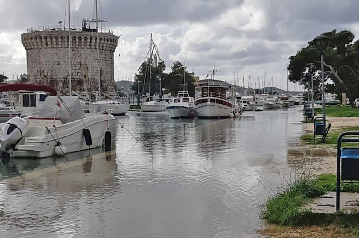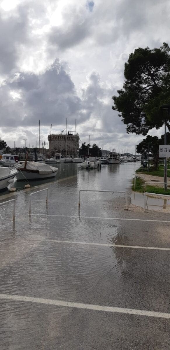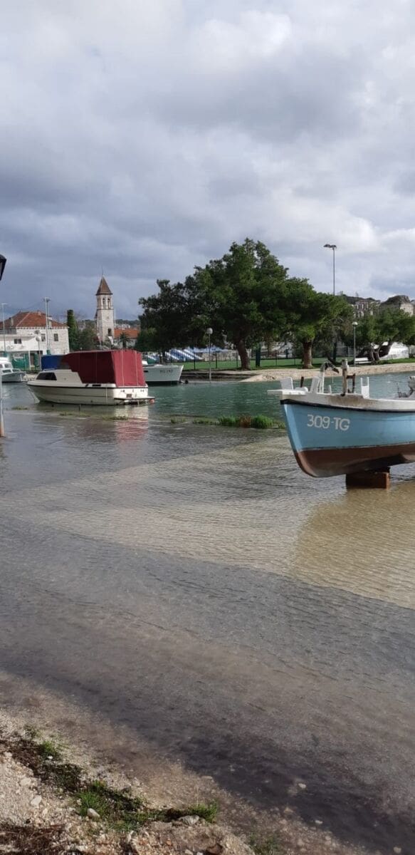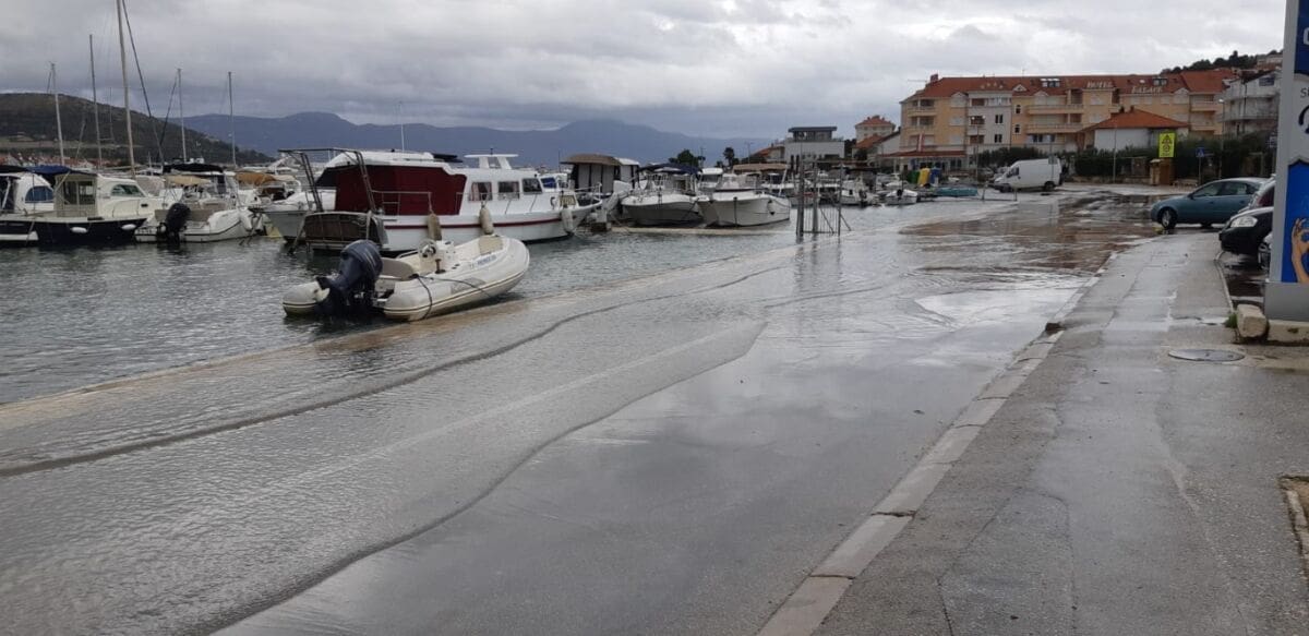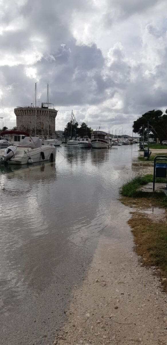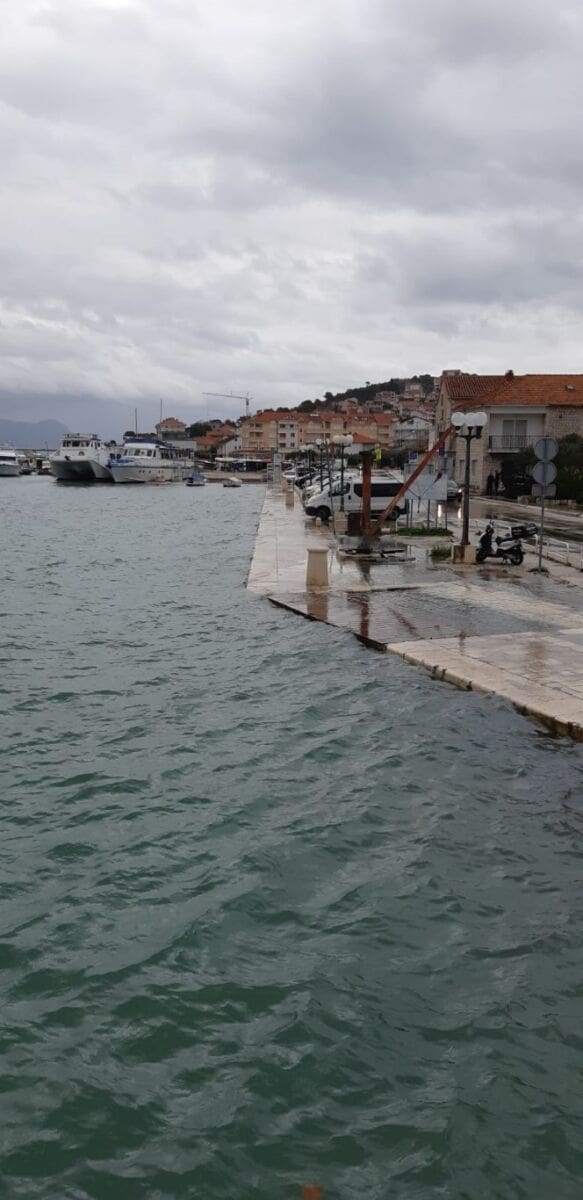 Niski tlak zraka uvjetovao je dizanje razine mora, no ono je ovoga puta malo manje izraženo nego u nedjelju kada su i valovi bili znatno veći. Donosimo vam prizore iz Trogira i Poljica kraj Marine.