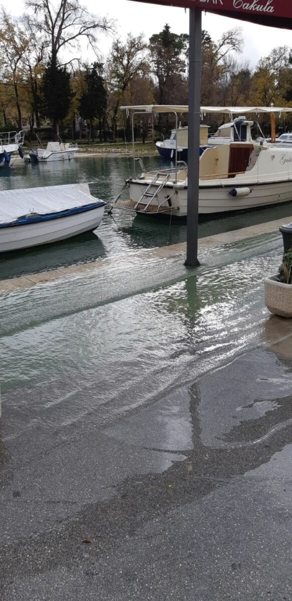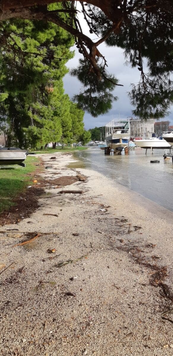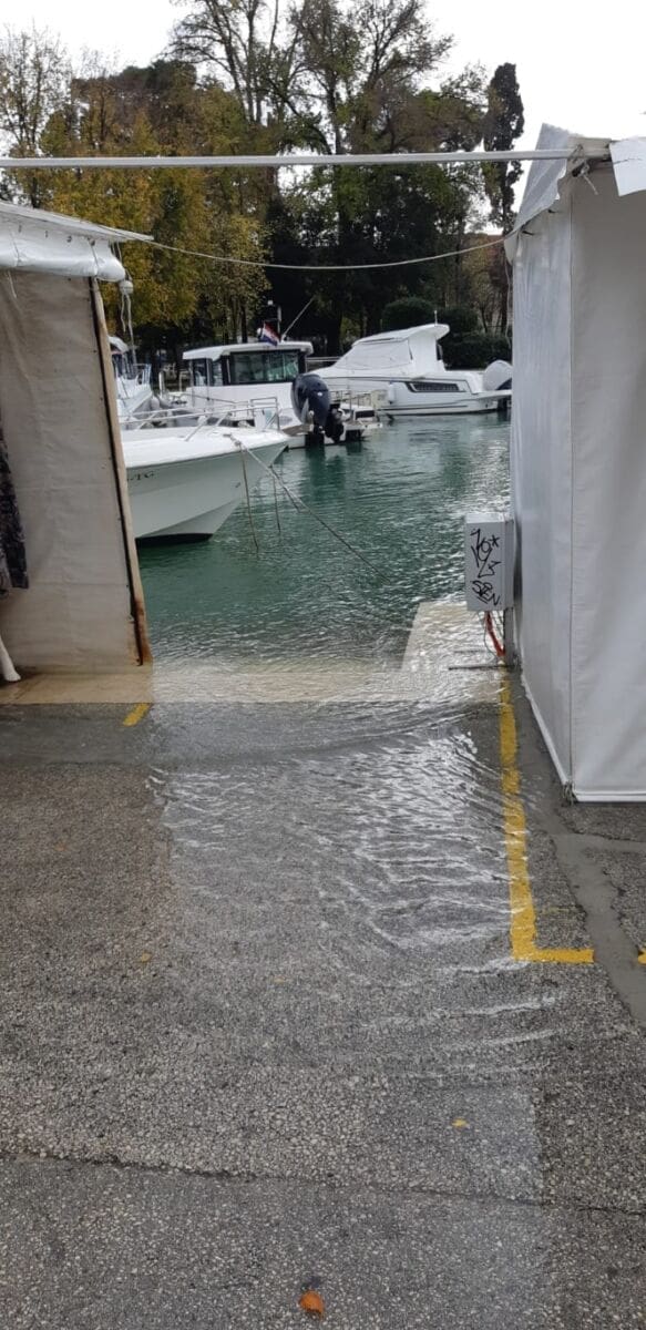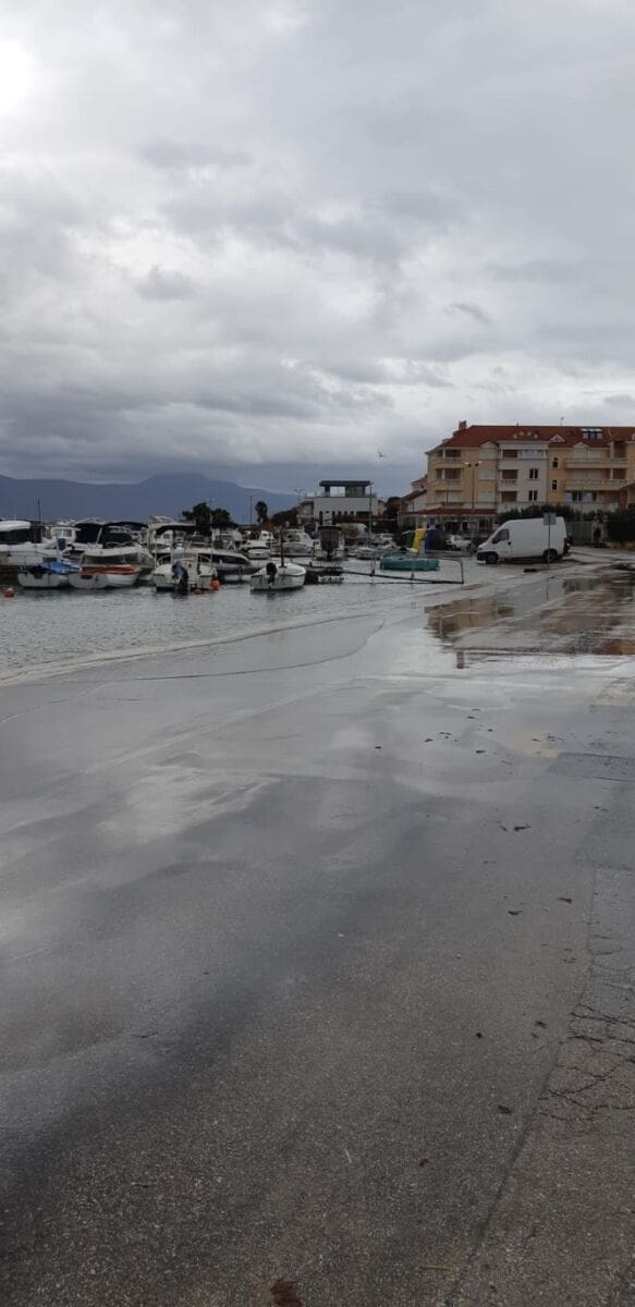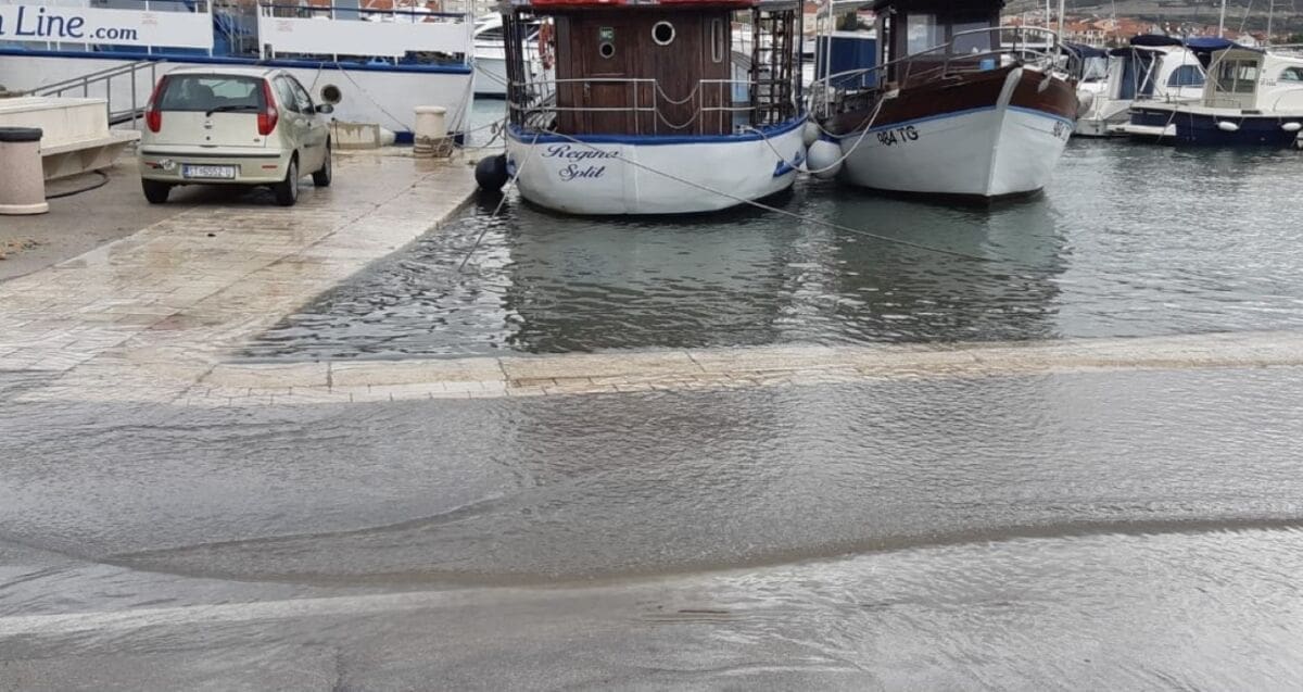 Niski tlak zraka uvjetovao je dizanje razine mora, no ono je ovoga puta malo manje izraženo nego u nedjelju kada su i valovi bili znatno veći. Donosimo vam prizore iz Trogira i Poljica kraj Marine.